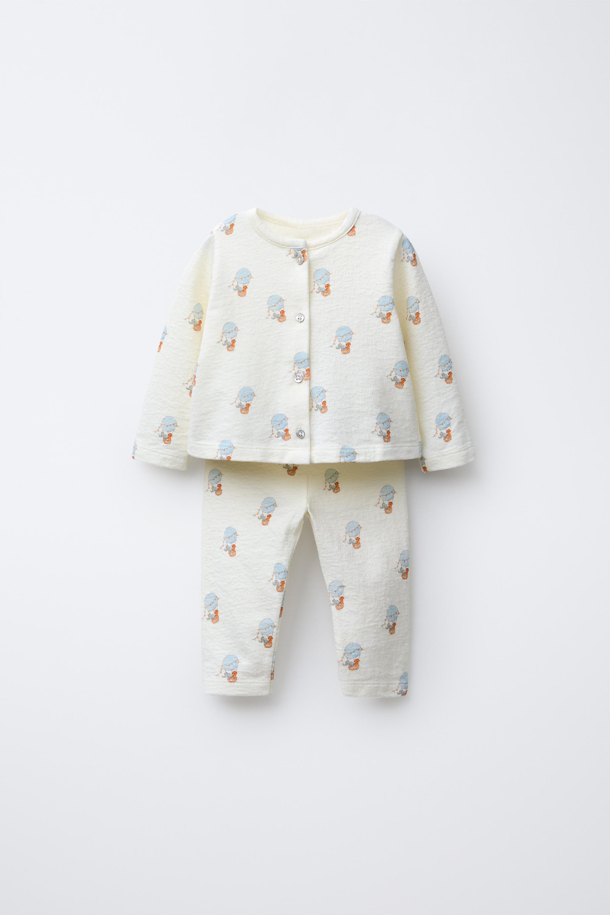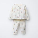 کت جکیت یقه دوچرخهای با آستینهای بلند. دارای بسته شدن با دکمه در جلو. تمام قسمتها با طرح چاپی. از پارچه ۱۰۰% پنبهای ساخته شده است.