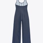 Halter yakalı ve yuvarlak yakalı uzun tulum. Kontrast dikiş detaylı. Açık sırtlı. Geniş paçalı. Boyundan bağlamalı.