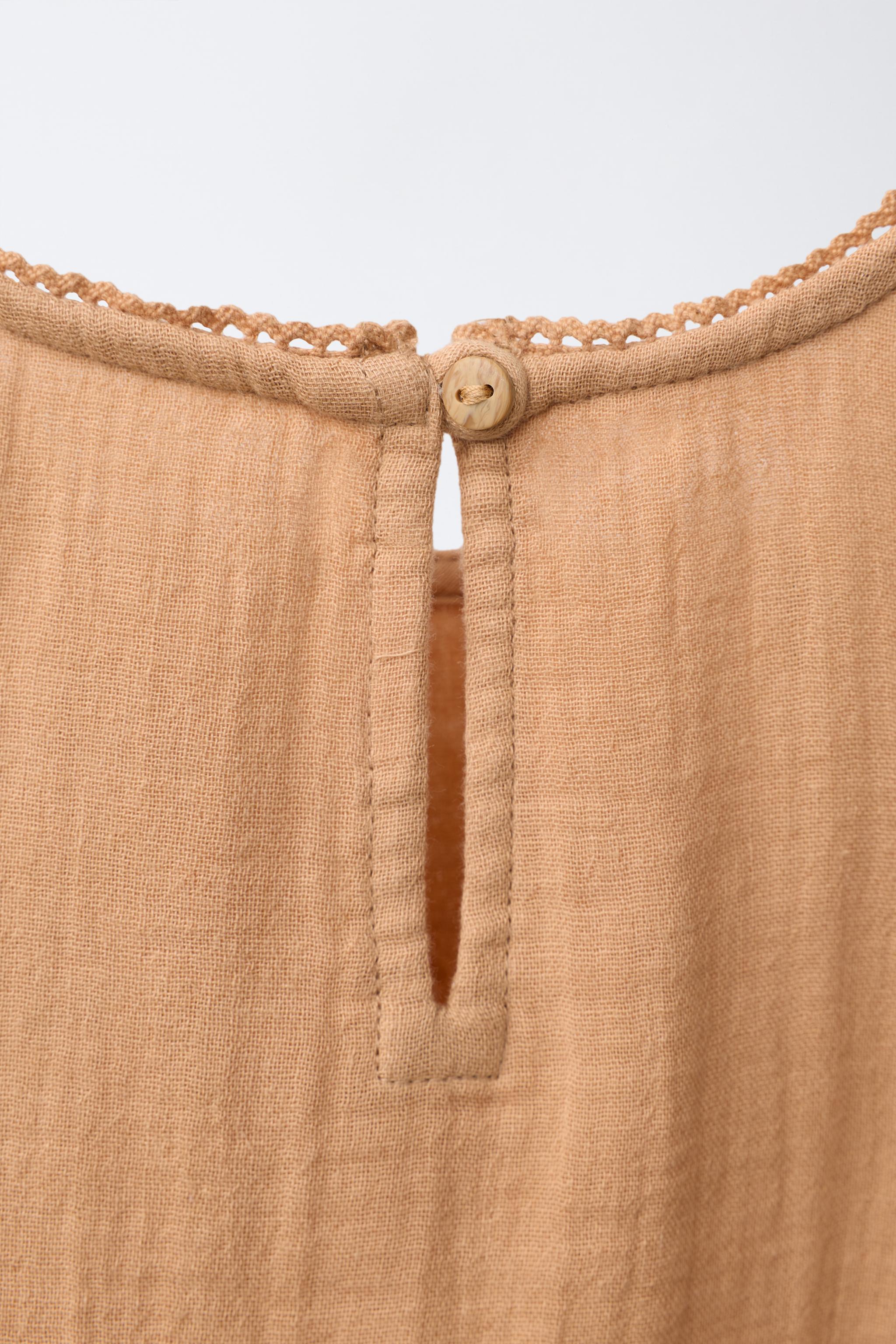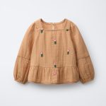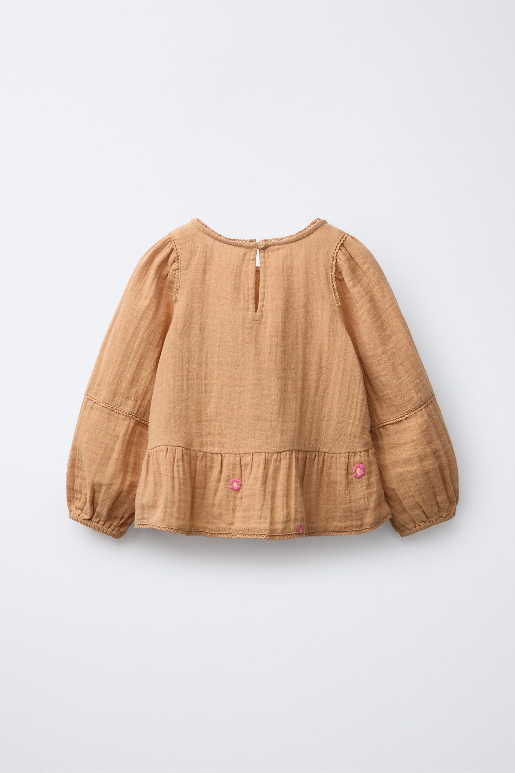 بلوز یقهدار و آستیندار با کش. بسته شدن از پشت با دکمه و چاک. دارای جزئیات گلدوزی شده با طرح گل به رنگ متضاد. لبه پایین بلوز با فِر و جزئیات دانتل تزئین شده است.