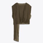 - Bisiklet yaka, kolsuz ve fularlı üst. Önü büzgülü etek ucu. Arkası açık ve düğme kapamalı.
