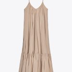 Dökümlü kumaştan üretilmiş midi elbise. V yakalı ve ince ayarlanabilir askılı. Etek ucu, pileli panellerle tamamlanmıştır.