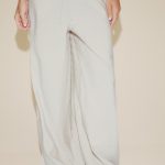 شلوار تولید شده از پارچه دکمهای. دارای بند قابل تنظیم، کمر کشی و ارتفاع متوسط. دارای جیبهای کناری.