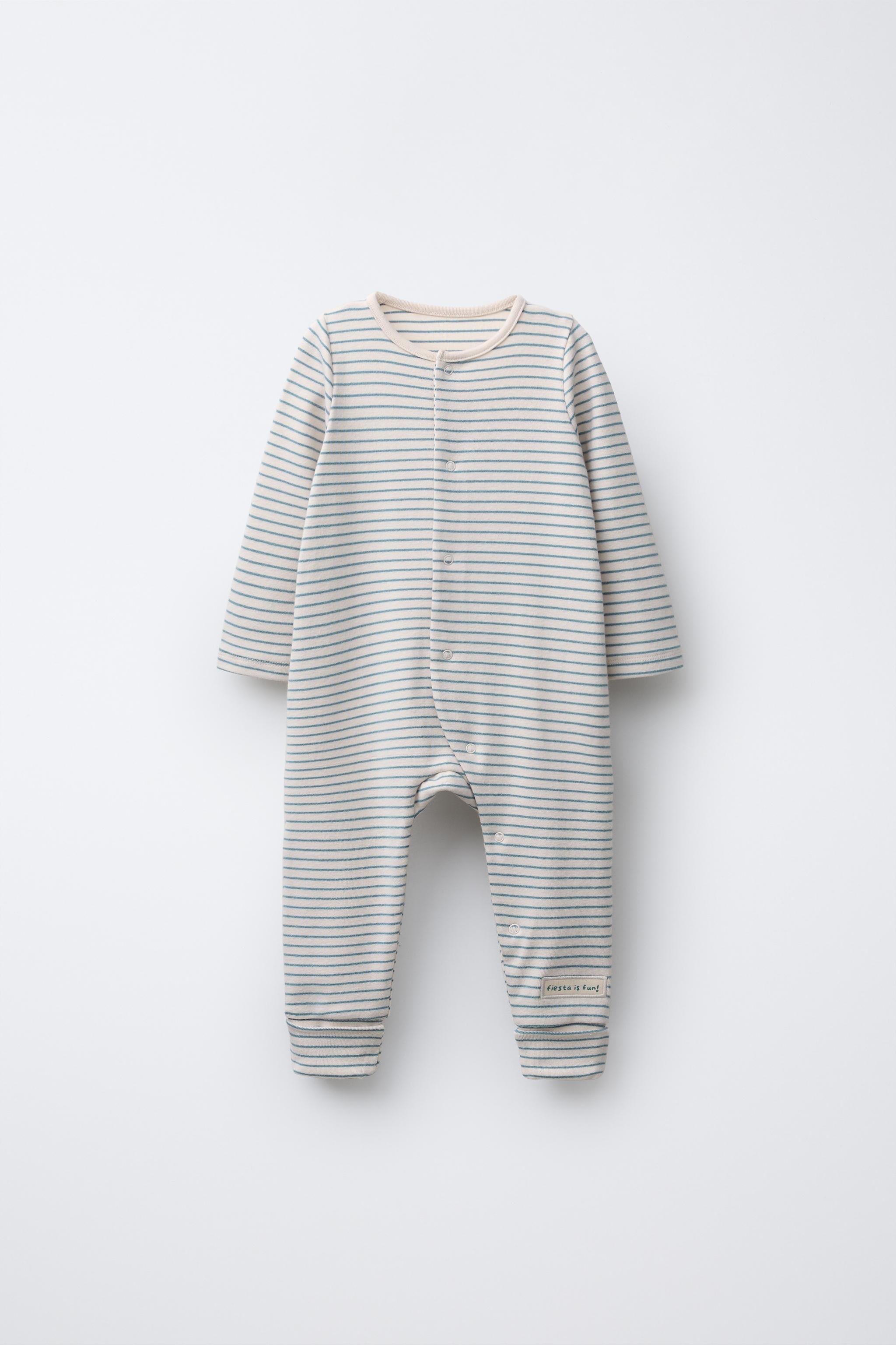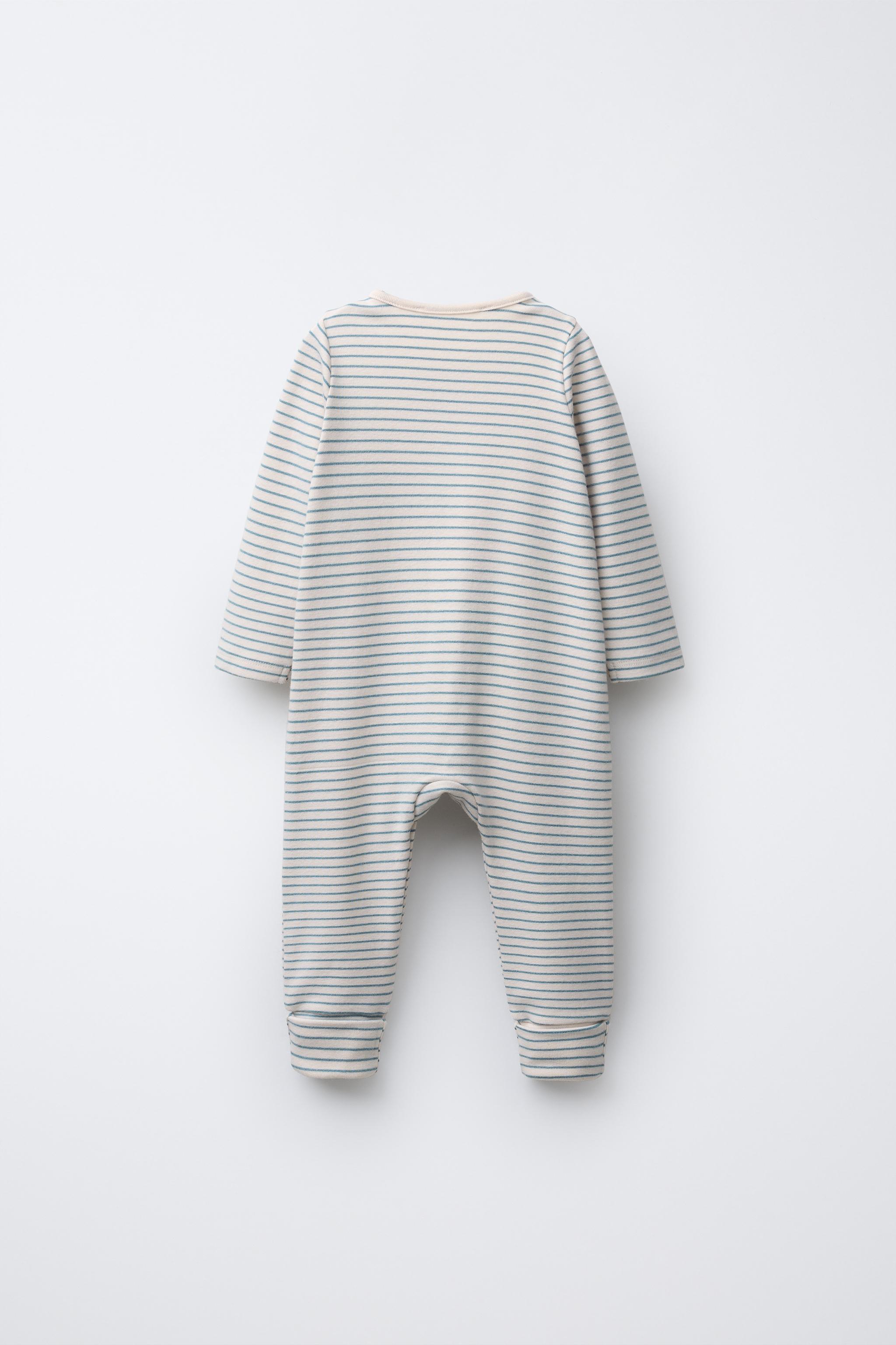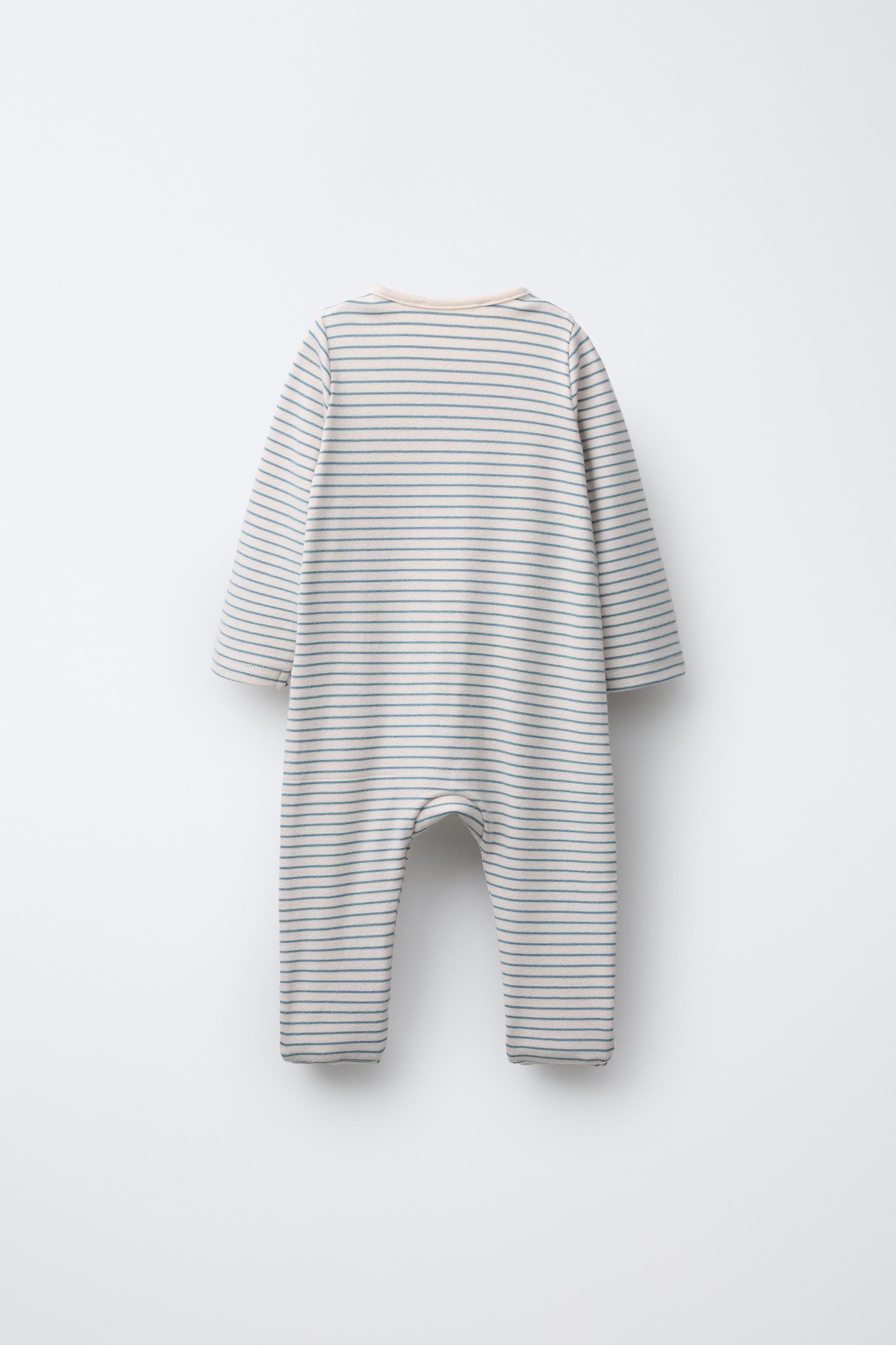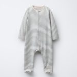 Bisiklet yaka ve uzun kollu, tulum pijama. Ayarlanabilir uzunlukta ve çoraba dönüştürülebilen, kapalı pijama altı. Önden çıtçıtlı kapama. Etek ucunda etiket aplikasyonu ve çizgili baskı.