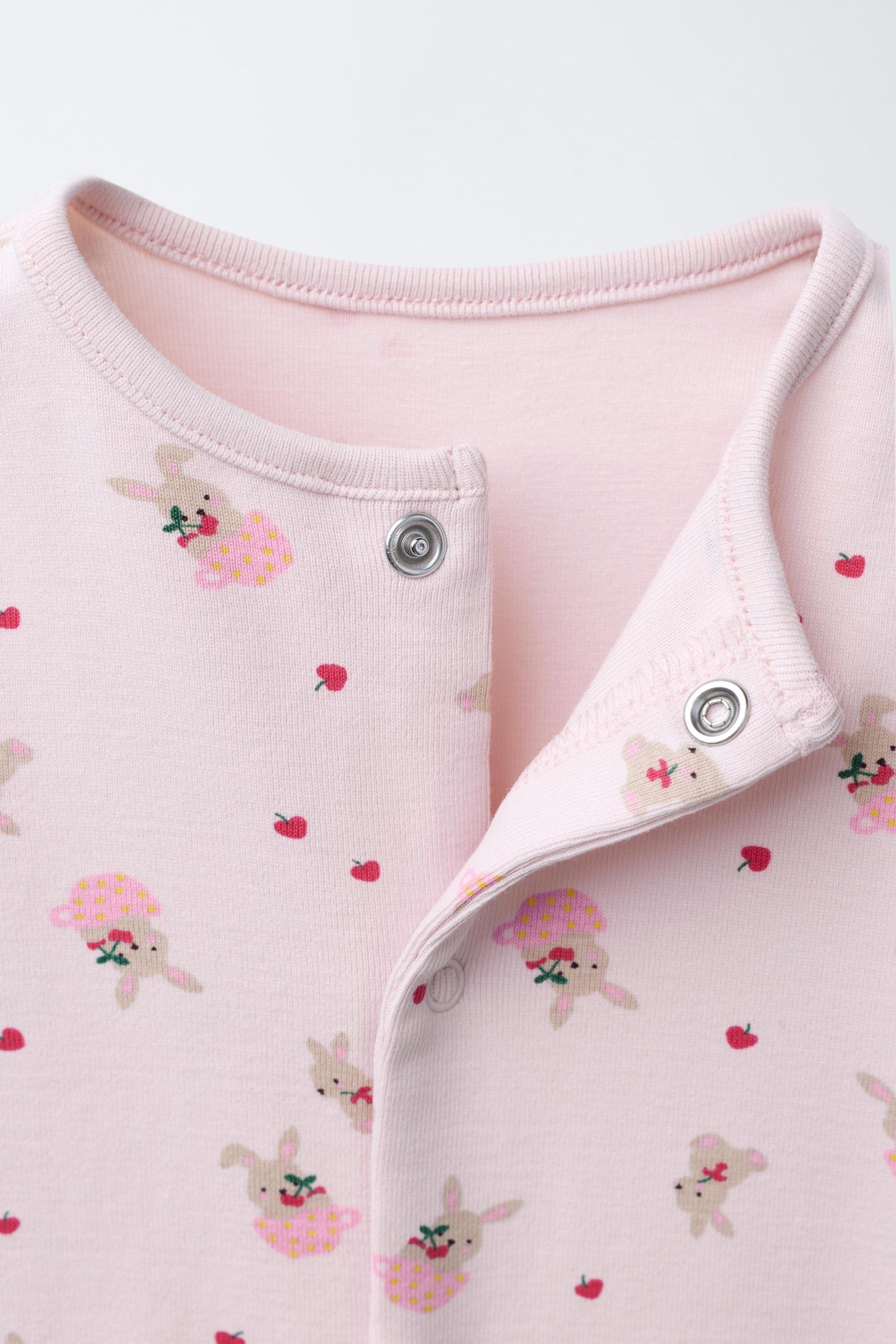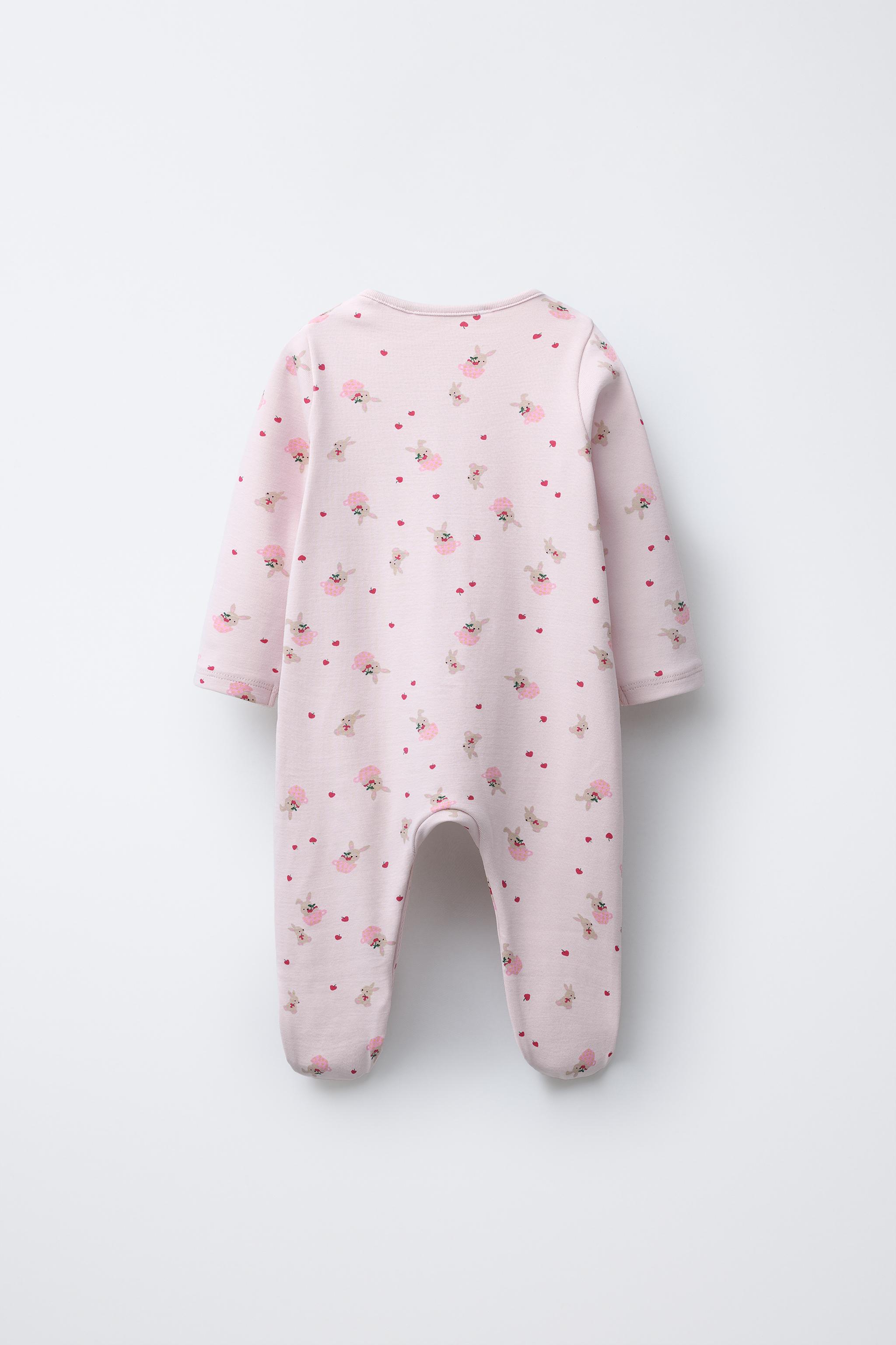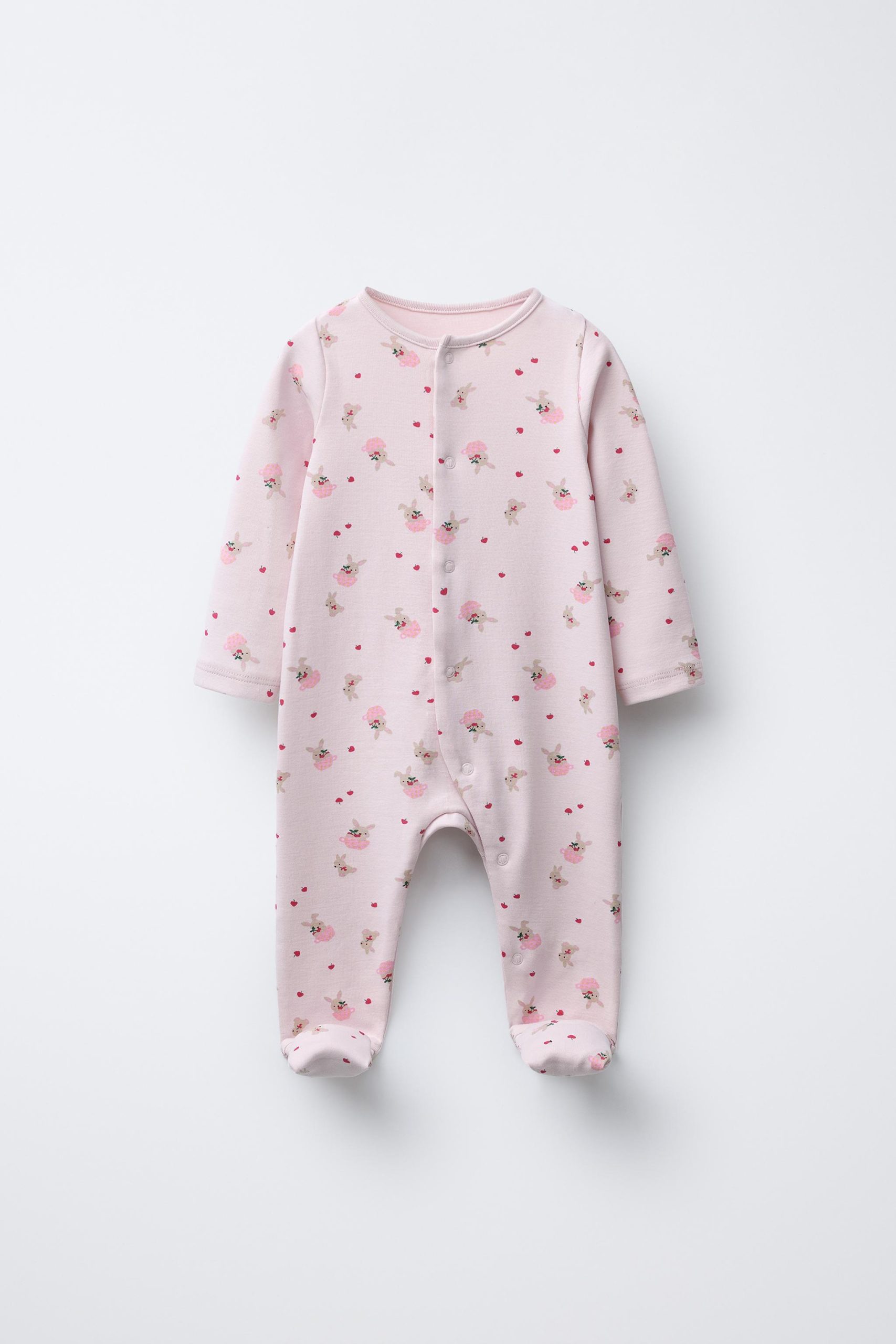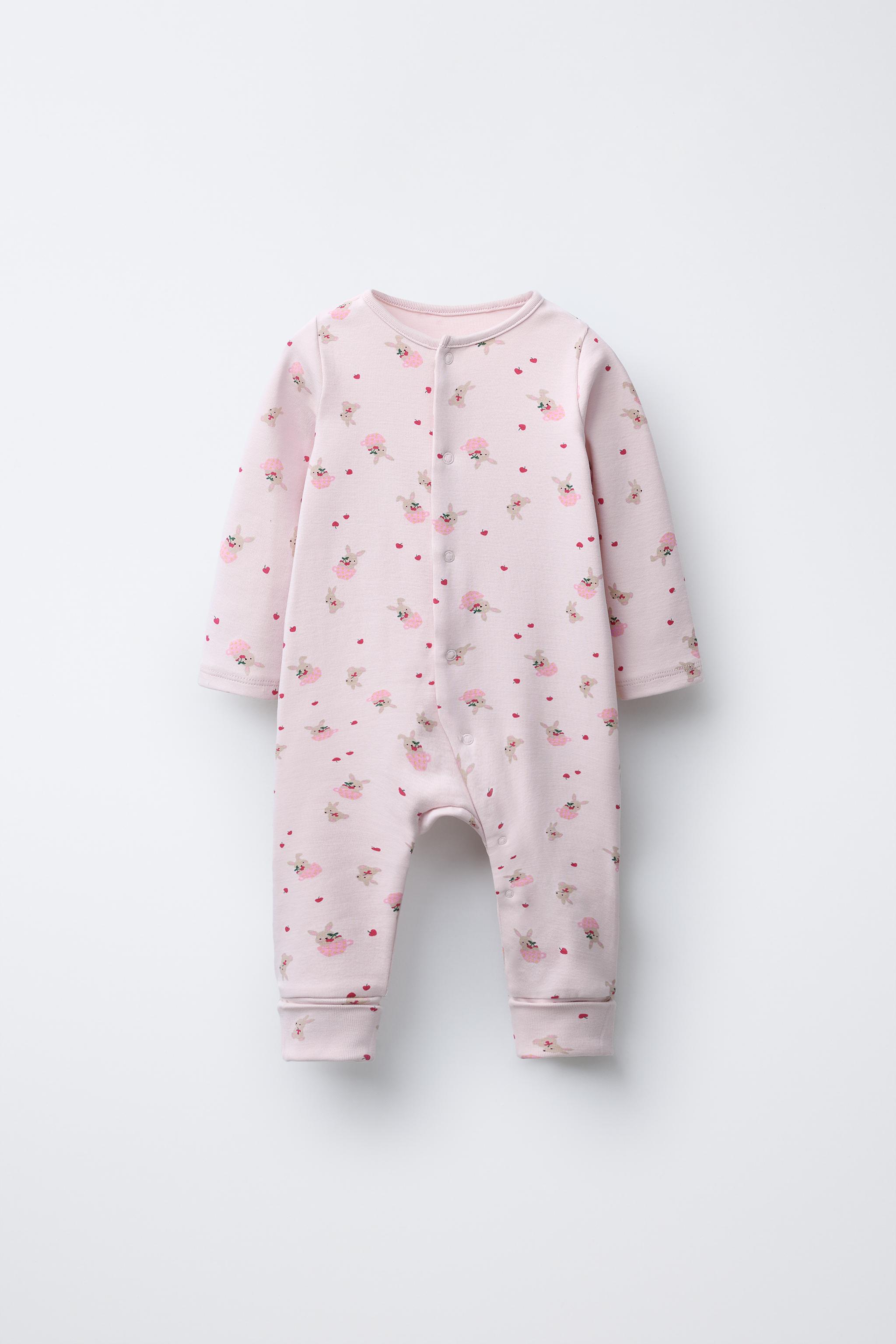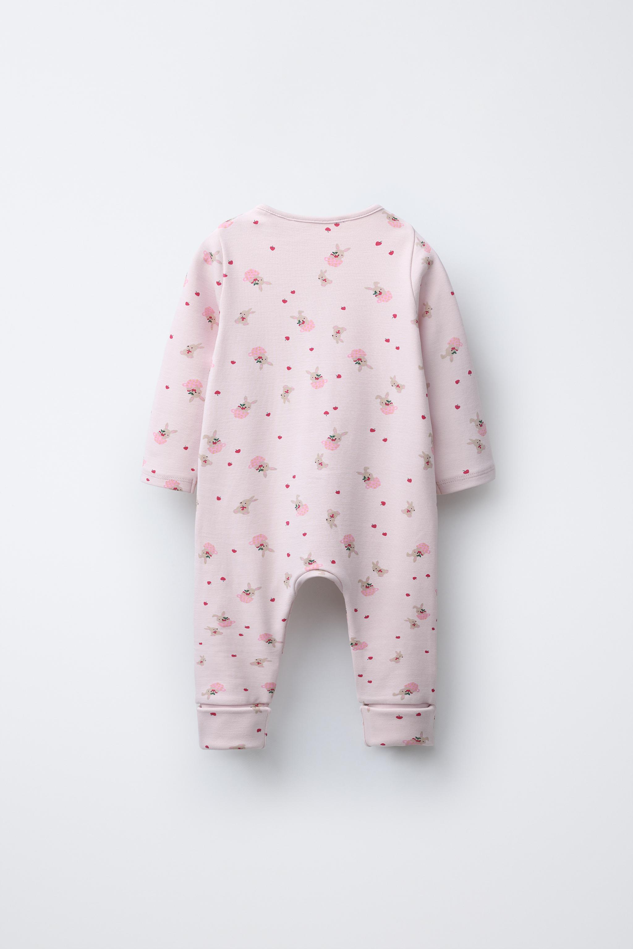 Bisiklet yaka, uzun kollu pijama. Ayarlanabilir uzunlukta ve çoraba dönüştürülebilen, kapalı pijama altı. Önü çıtçıtlı düğme kapamalı. Tavşan desenli. %95 pamuklu kumaştan üretilmiştir.