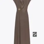 - Dökümlü yakalı, düşük kollu elbise. Önü metal aksesuarlı ve drapeli kumaş detaylı. Düz etek uçlu.