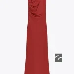 Dökümlü, drapeli yakalı, kolsuz, uzun elbise. Etek ucu kloş kesimdir.