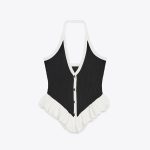 V yaka, ince askılı top. Açık sırtlı. Kontrast renkli fırfır detaylı etek ucu. Önden metal düğmeli kapama.
