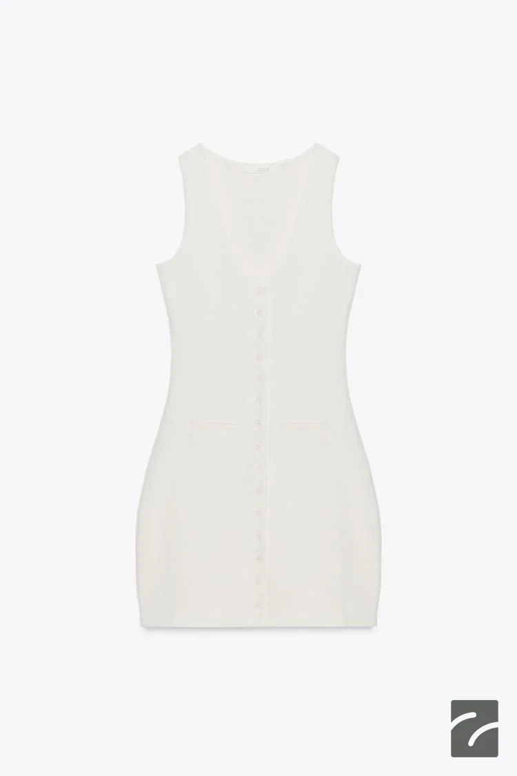 این لباس کوتاه از پارچه بافتنی سفت، نرم و مات، انعطافپذیر و الاستیک تولید شده است. دارای یقه V و بدون آستین است. در قسمت جلو، جیبهای با نوار و دکمههای بسته شدن قرار دارد.