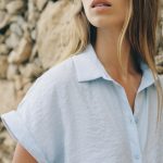 - Kıvrık kısa kollu, yakalı gömlek. Önden düğmeli ve bağlamalı.