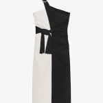 - Asimetrik yakalı, altın rengi detaylı kalın askılı elbise. Beli yanlardan büzgülü ve önü düğümlü. Yan dikişte gizli fermuarlı.