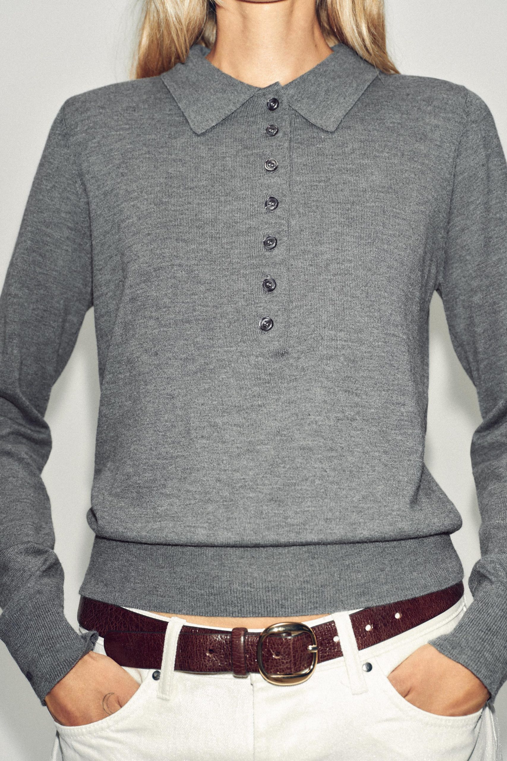 • Uzun kollu polo yaka kazak. Önü düğmeli.