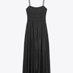 Viskoz iplikten üretilmiş midi elbise. Elastik düz yaka ve ayarlanabilir ince askılar. Göğüs kısmında elastiklerle drape detayı.