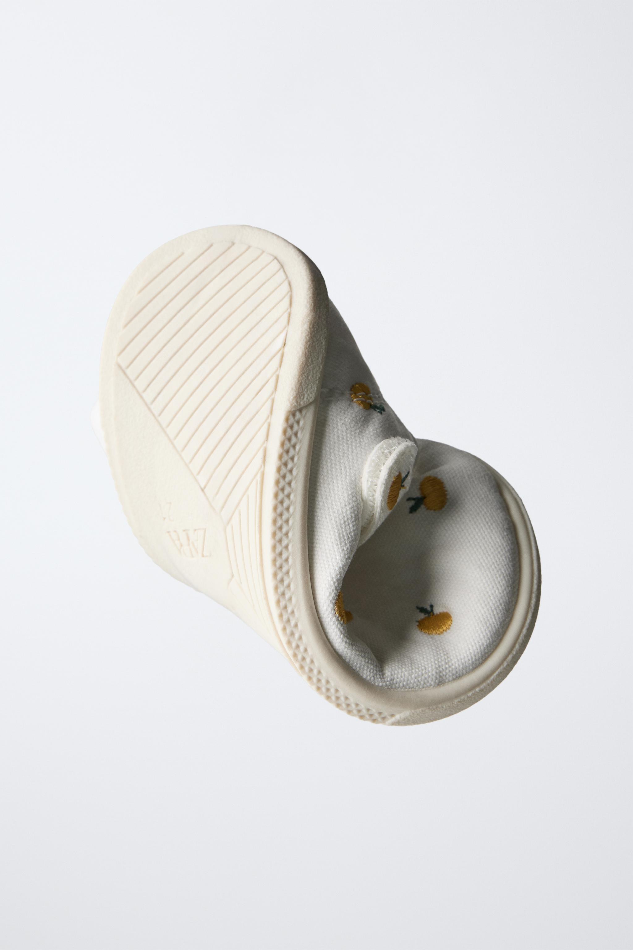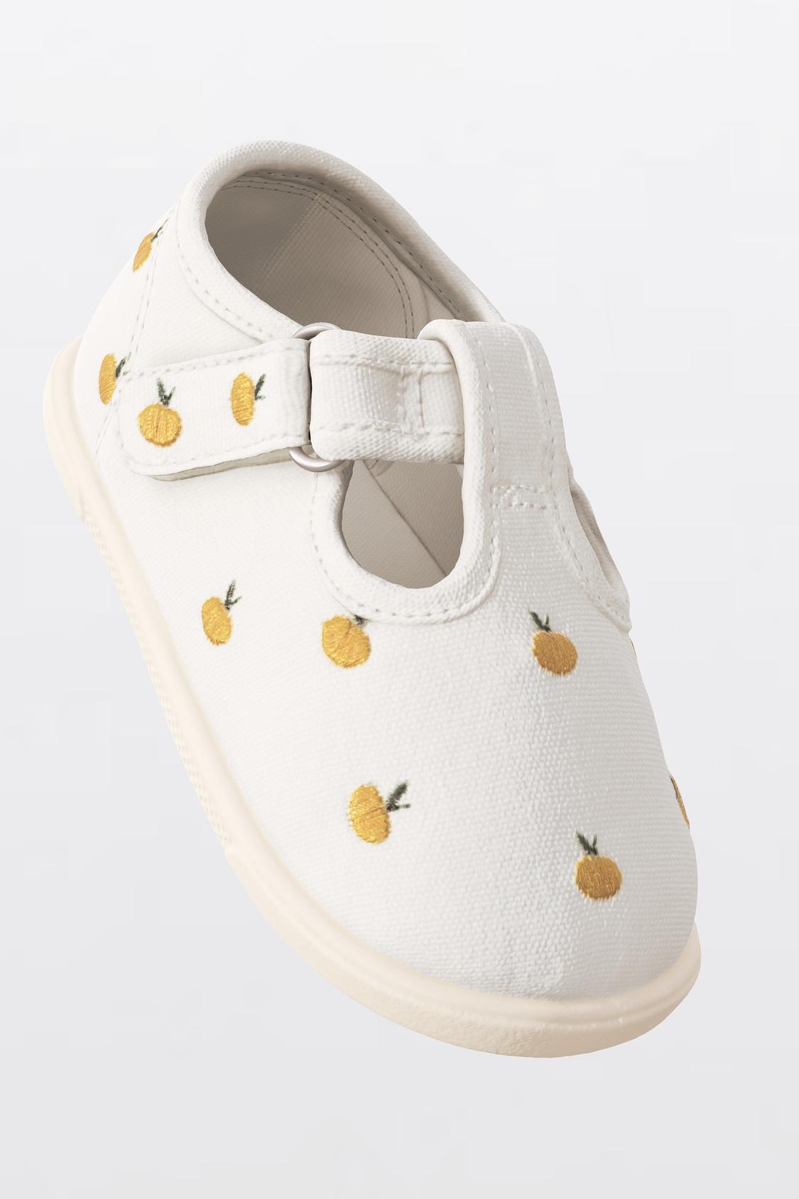 %95 pamuklu, yüksek esnekliğe sahip bamba tipi ayakkabı. Kesimde işlenmiş elma detayı. Yuvarlak, geniş ve işlevsel burun kısmı, parmakların serbestçe hareket etmesi için alan sağlar. Daha fazla destek için ayak üstünde ayarlanabilir yapışkan bantlı kapama. Çıkarılabilir iç taban. Uygun damlalıklı ve çok esnek topuklu esnek kauçuk taban.