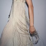 پیراهن میدی ترکیبی با یقه V و بندهای نازک. دارای گلدوزی‌های گل‌دار و مهره‌های هماهنگ. با لبه‌های چین‌دار و نوارهای آویزان تکمیل شده است. بسته شدن با دکمه در قسمت پشت.