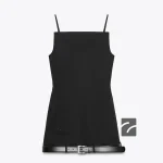 Düz yakalı ve ince askılı, kısa elbise. Etek ucunda metal tokalı kemer. İç astarı mevcut. Dikişte gizli ön fermuar kapamalı.