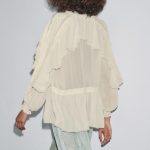 بلوزی از الیاف ویسکوز. دارای یقه گرد و آستینهای بلند با جزئیات مچ. دارای لبههای فری و اپلیکیشن گیپور با رنگ هماهنگ از همان پارچه. لبه دامن با پاپیون تزئین شده است.
