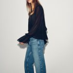 بلوز دوخته شده با یقه دوچرخهای، دارای بندهای قابل تنظیم در پشت و طراحی آزاد. آستینهای بلند با کش و لبههای فری و دکمهدار. دامن نامتقارن با لبههای فری از همان پارچه.