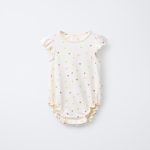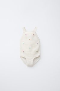 - Bisiklet yaka ve kısa kollu, fırfır aplikeli tulum. Lastikli ve fırfırlı etek ucu. Arkası damla şeklinde düğmeli ve alt kısmı çıtçıtlı. Meyve baskılı. %100 pamuklu kumaş.