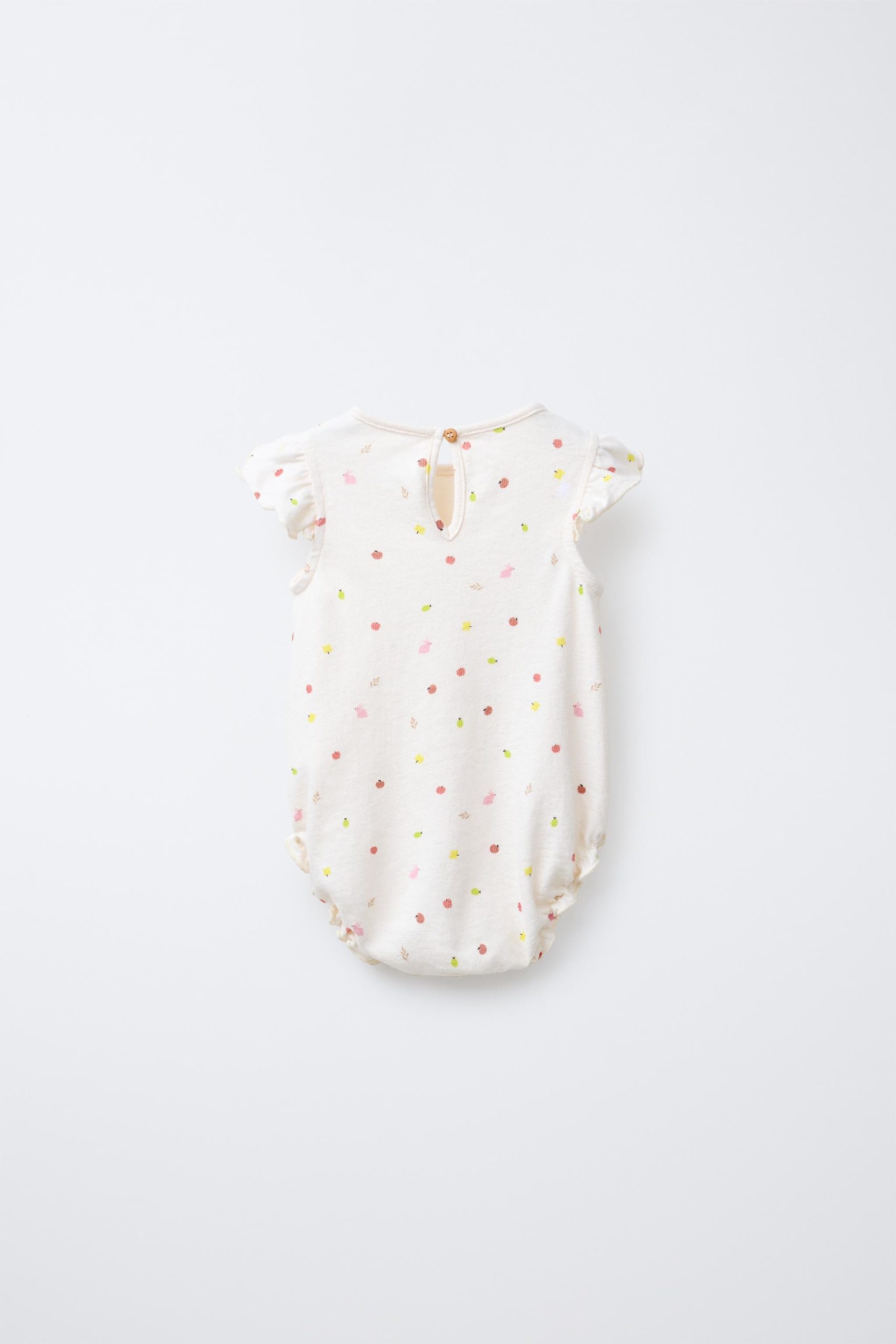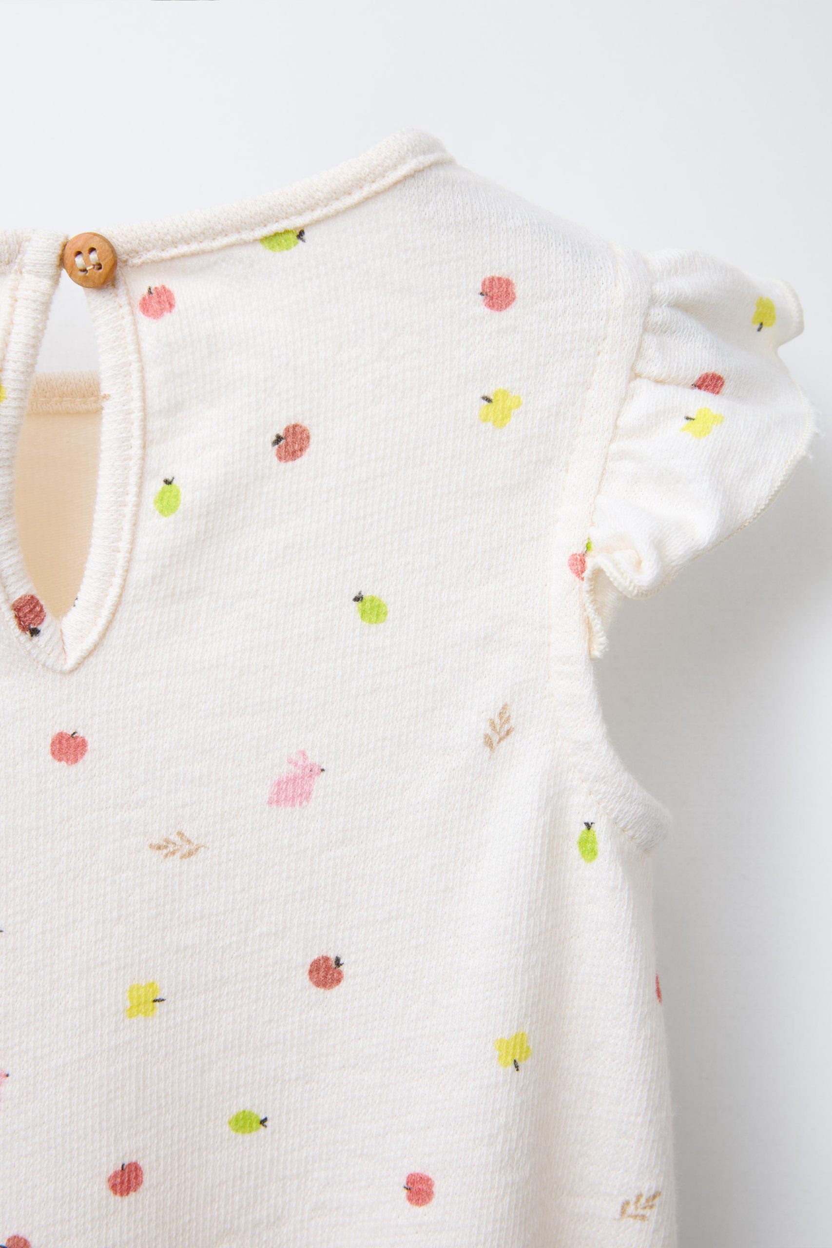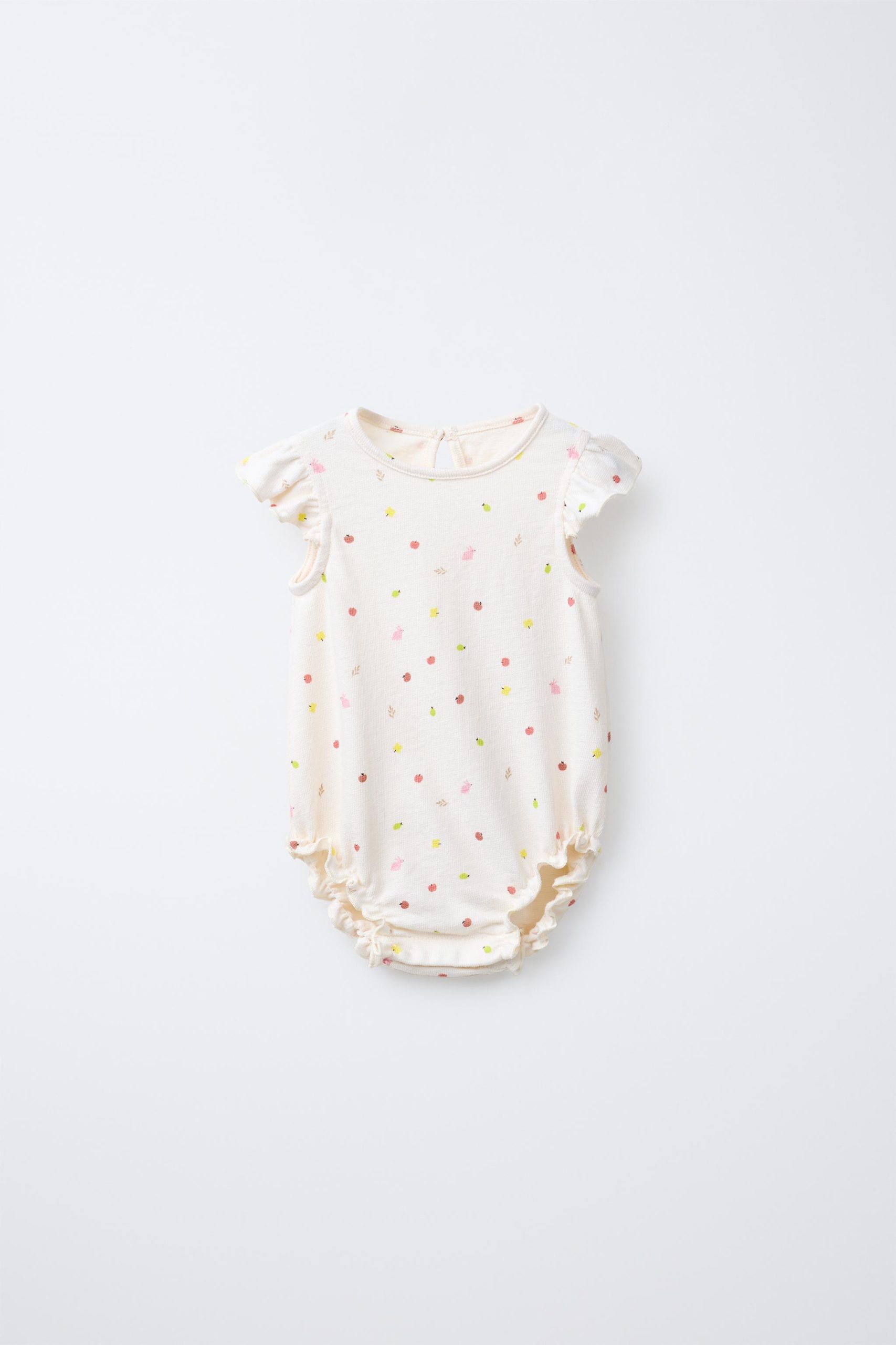 Bisiklet yaka ve kısa kollu, fırfır aplikeli tulum. Lastikli ve fırfırlı etek ucu. Arkası damla şeklinde düğmeli ve alt kısmı çıtçıtlı. Meyve baskılı. %100 pamuklu kumaş.