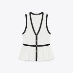 تاپ بدون آستین V یقه. پارچه کشی. دارای لبه‌های متضاد. پایین لباس به شکل پیپلم. بسته شدن از جلو با دکمه‌های فلزی.