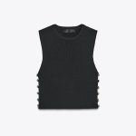 تاپ کوتاه یقهدار، بدون آستین و با جزئیات دکمههای فلزی نامتقارن در کنارهها.