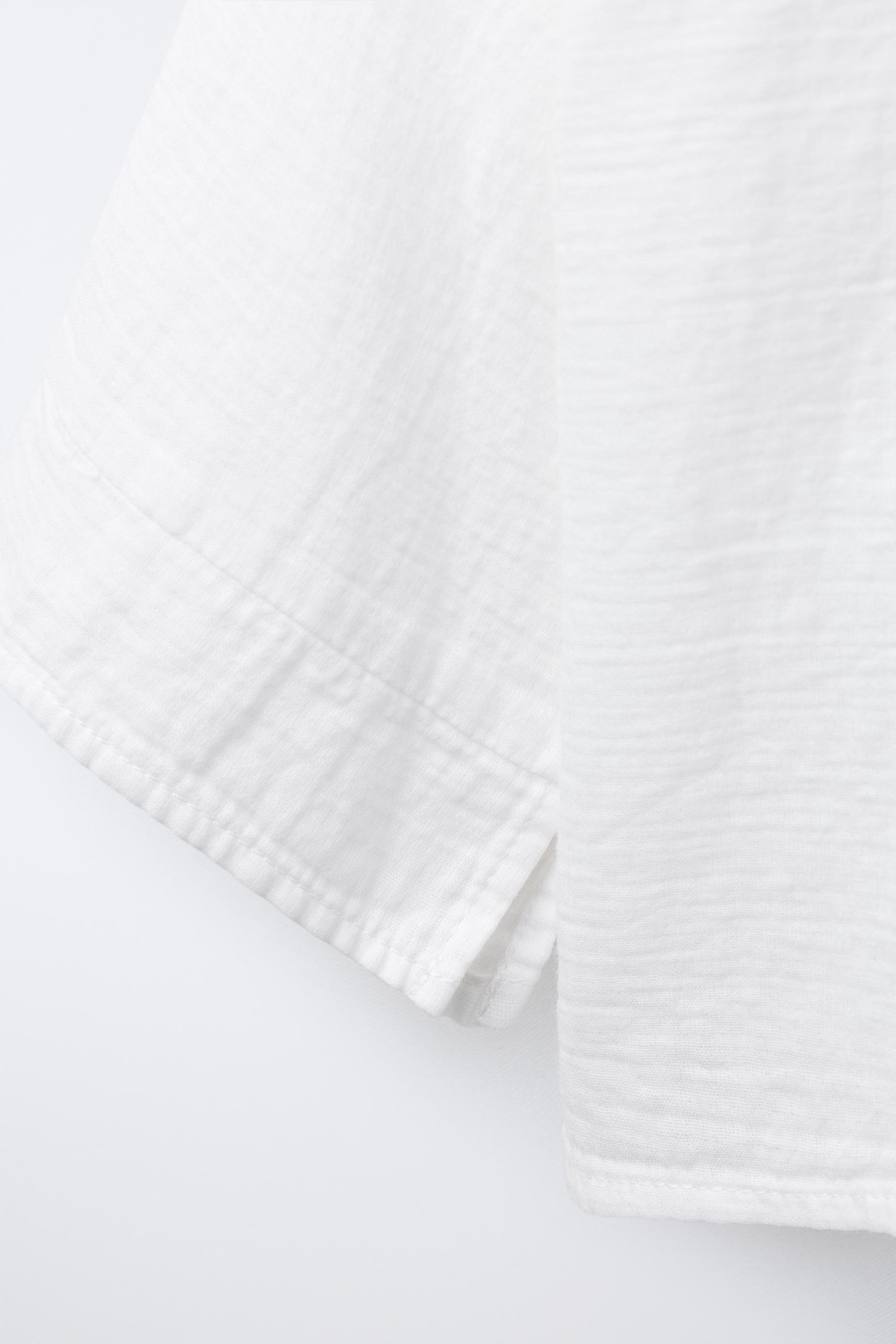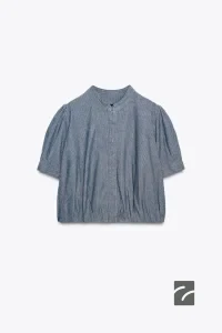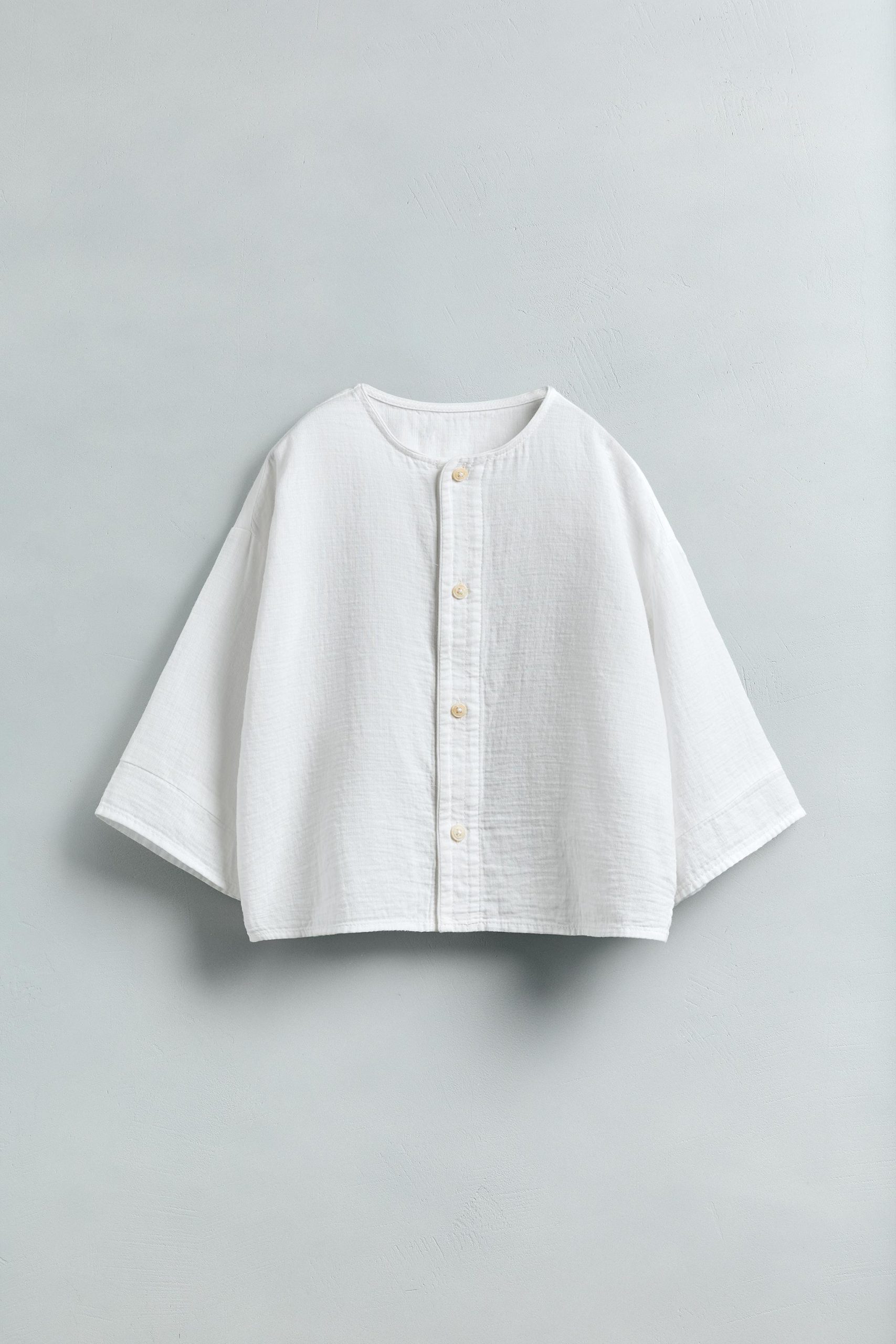 Bisiklet yakalı ve geniş uzun kollu, yırtmaç detaylı gömlek. Önden düğme kapamalı.