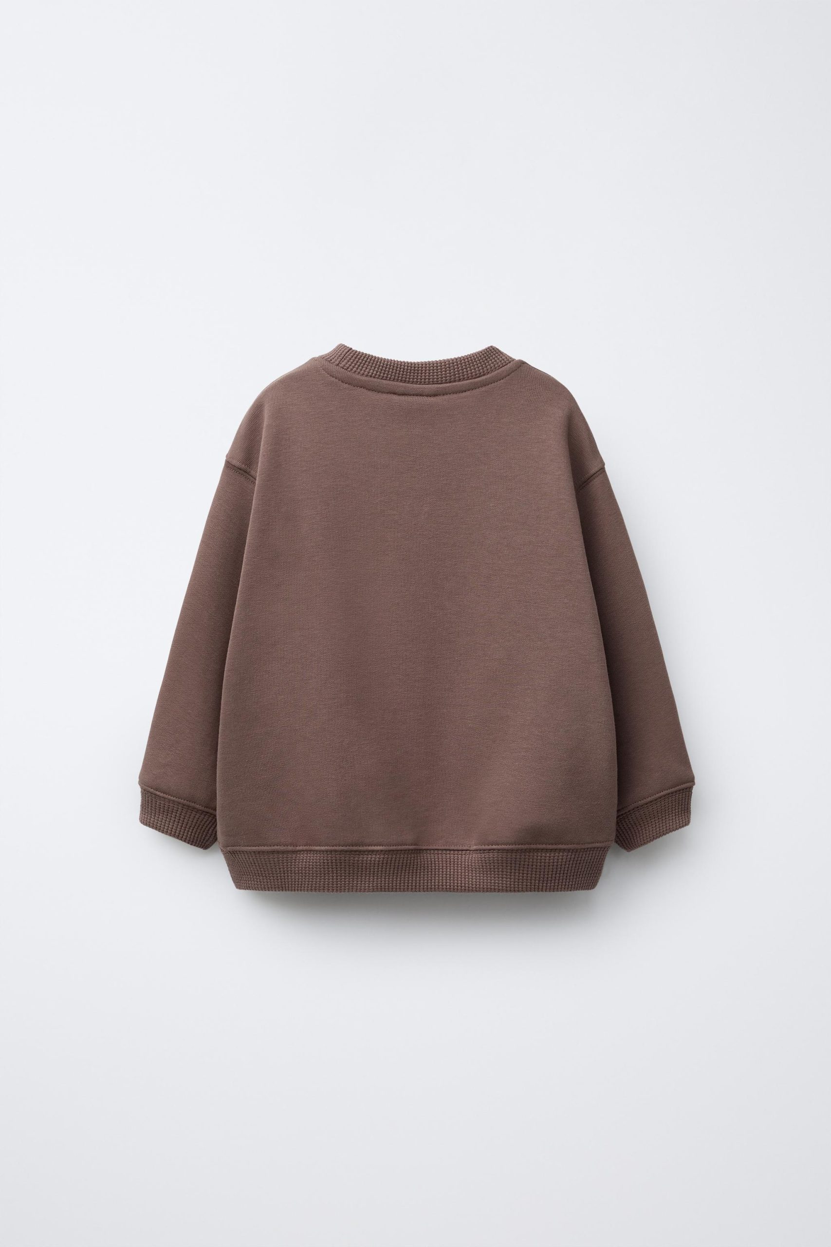 Bisiklet yaka, uzun kollu sweatshirt. Fitilli şeritli, gofre kumaş baskılı. Önü dantel detaylı. %70 pamuklu kumaş.