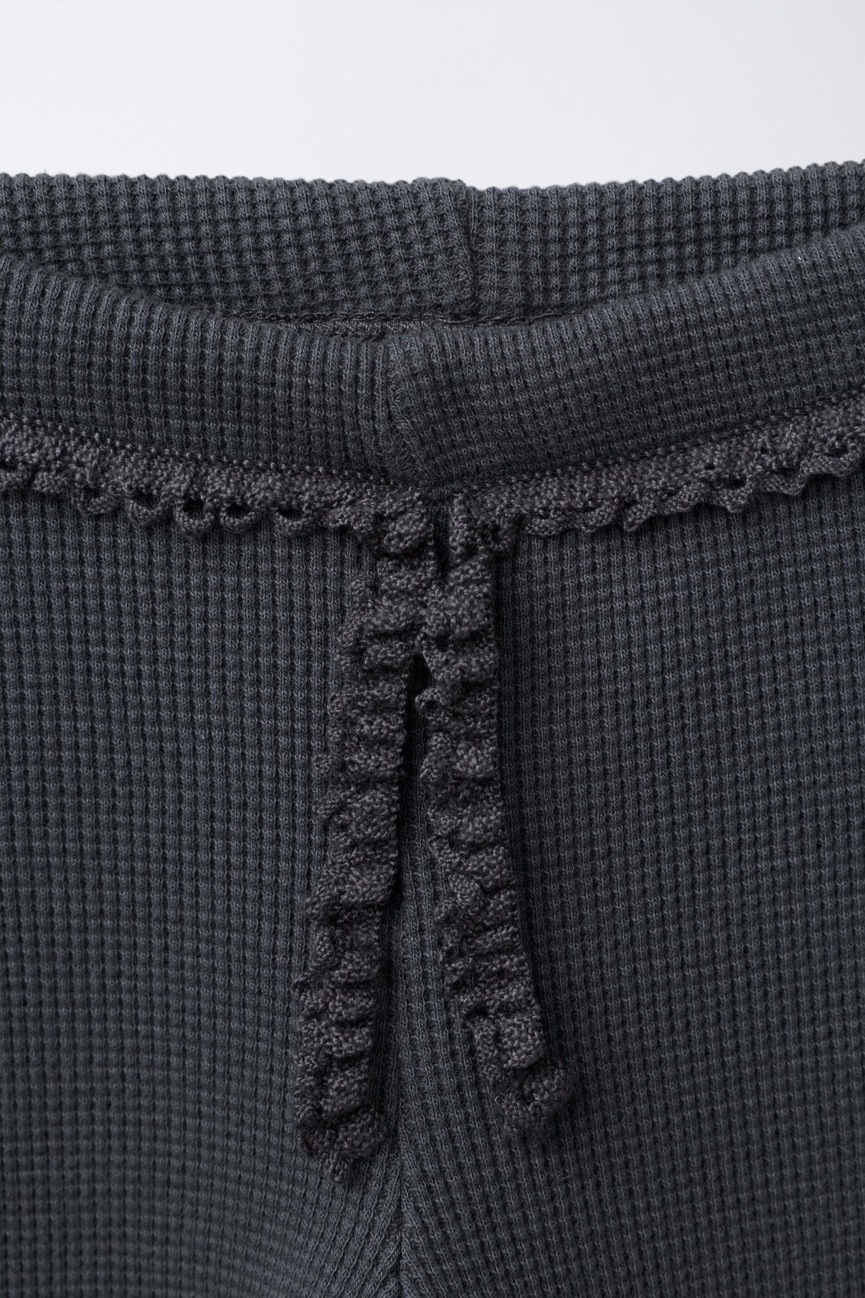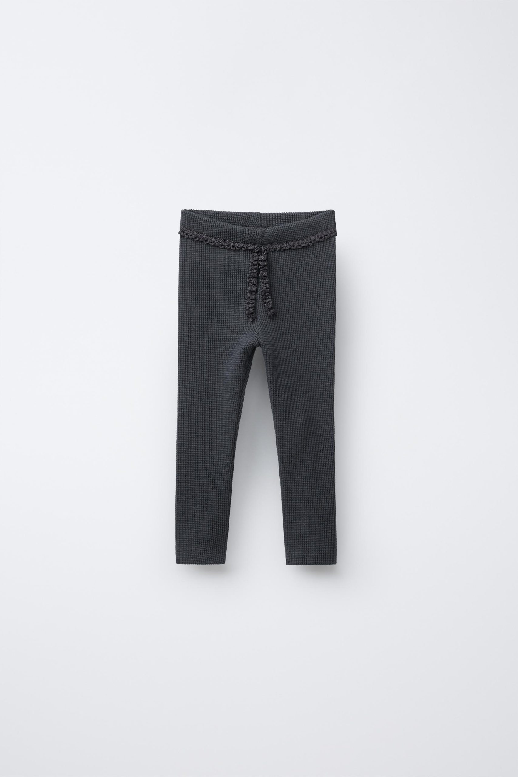 Elastik belli, önü bağcıklı, gofre kumaş tayt. Dantel detaylı.