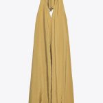 Dökümlü kumaştan üretilmiş midi elbise. Bağcıklı halter yakalı ve V yakalı. Açık sırtlı.