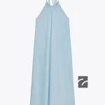 پیراهن میدی از پارچه دکملو تولید شده است. یقه هالتر با بند قابل تنظیم.