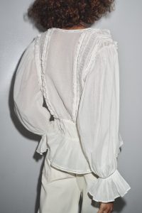 تاپ با یقه هالتر، یقه V و جزئیات پشت باز. کمر آن از دو طرف جمع شده است. پشت تاپ با دکمههای همرنگ بسته میشود.
