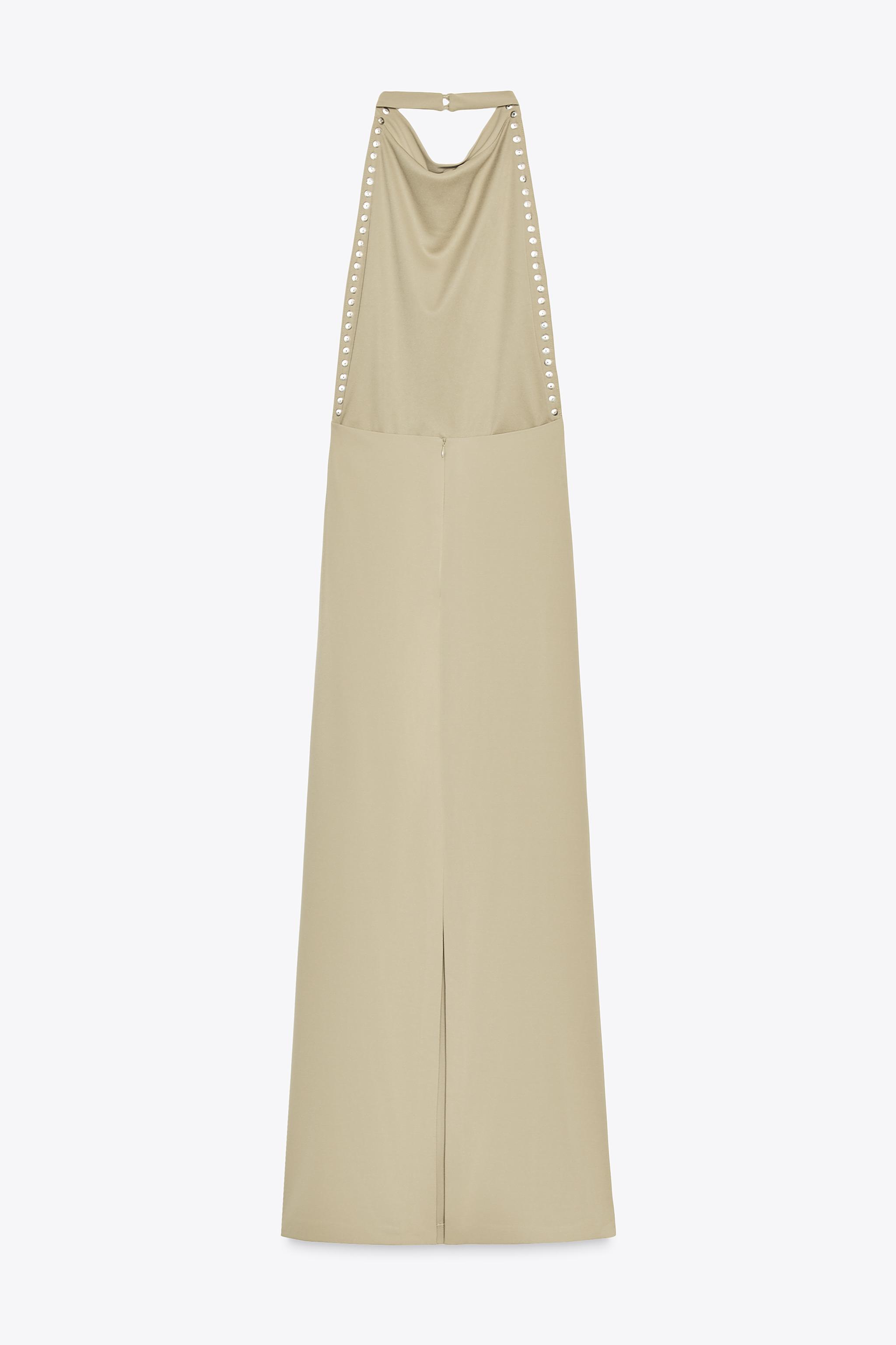 - Halter yaka, drapeli elbise. Açık sırt detaylı. İç astarlı. Arkası yırtmaçlı. Arkadan gizli dikişli fermuarlı.