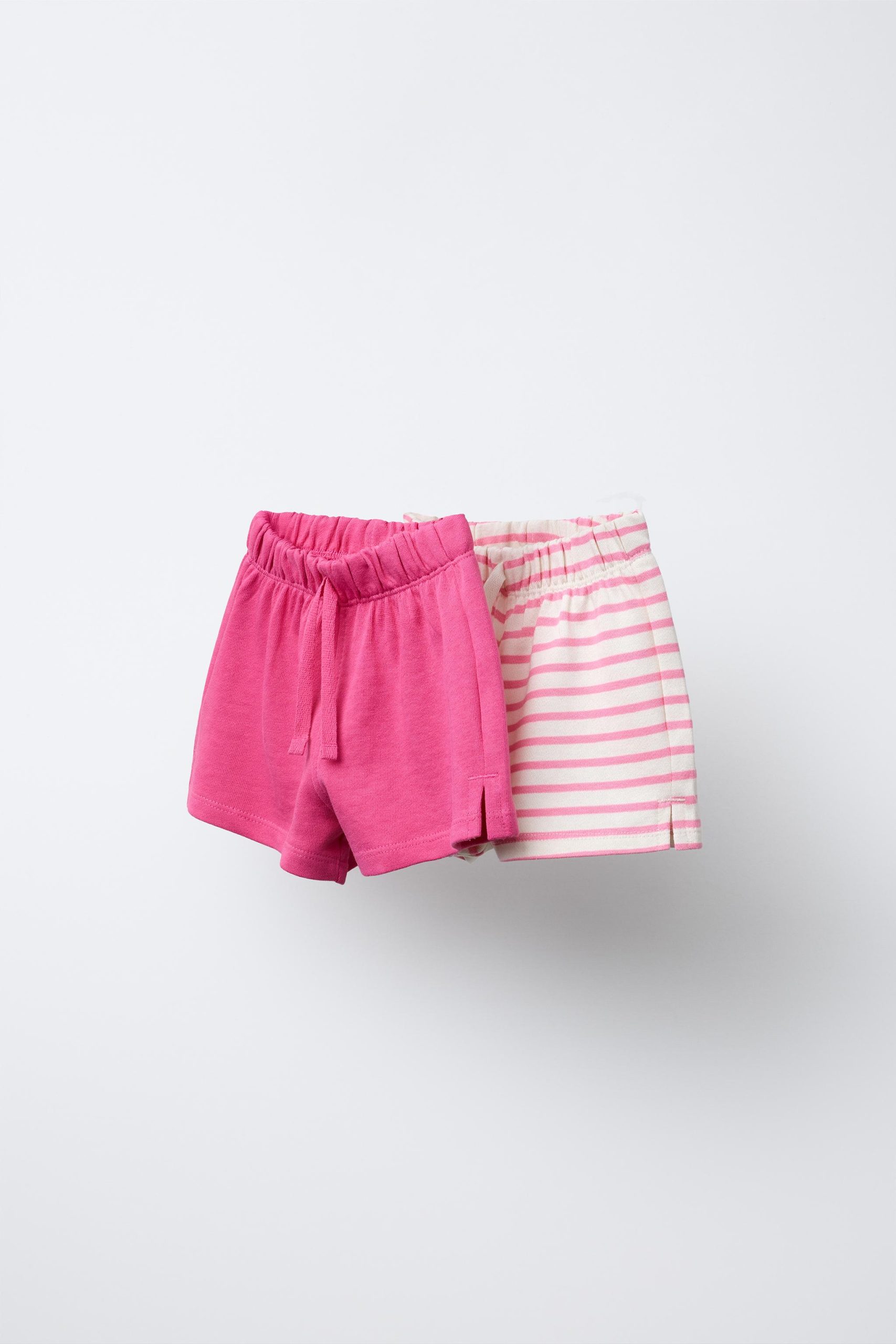 Elastik belli ve önü bağcıklı iki adet bermuda şorttan oluşan paket. Yan yırtmaçlı etek ucu. Kumaş %90 pamuk.