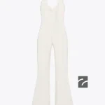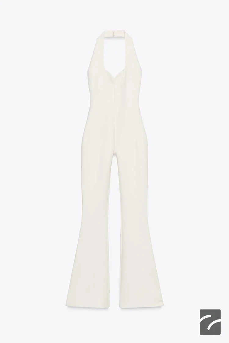 Sıkı, yumuşak ve opak dokulu, esnek ve elastik örgü kumaştan halter yakalı tulum. Açık sırtlı. Etek ucu kloş kesim.