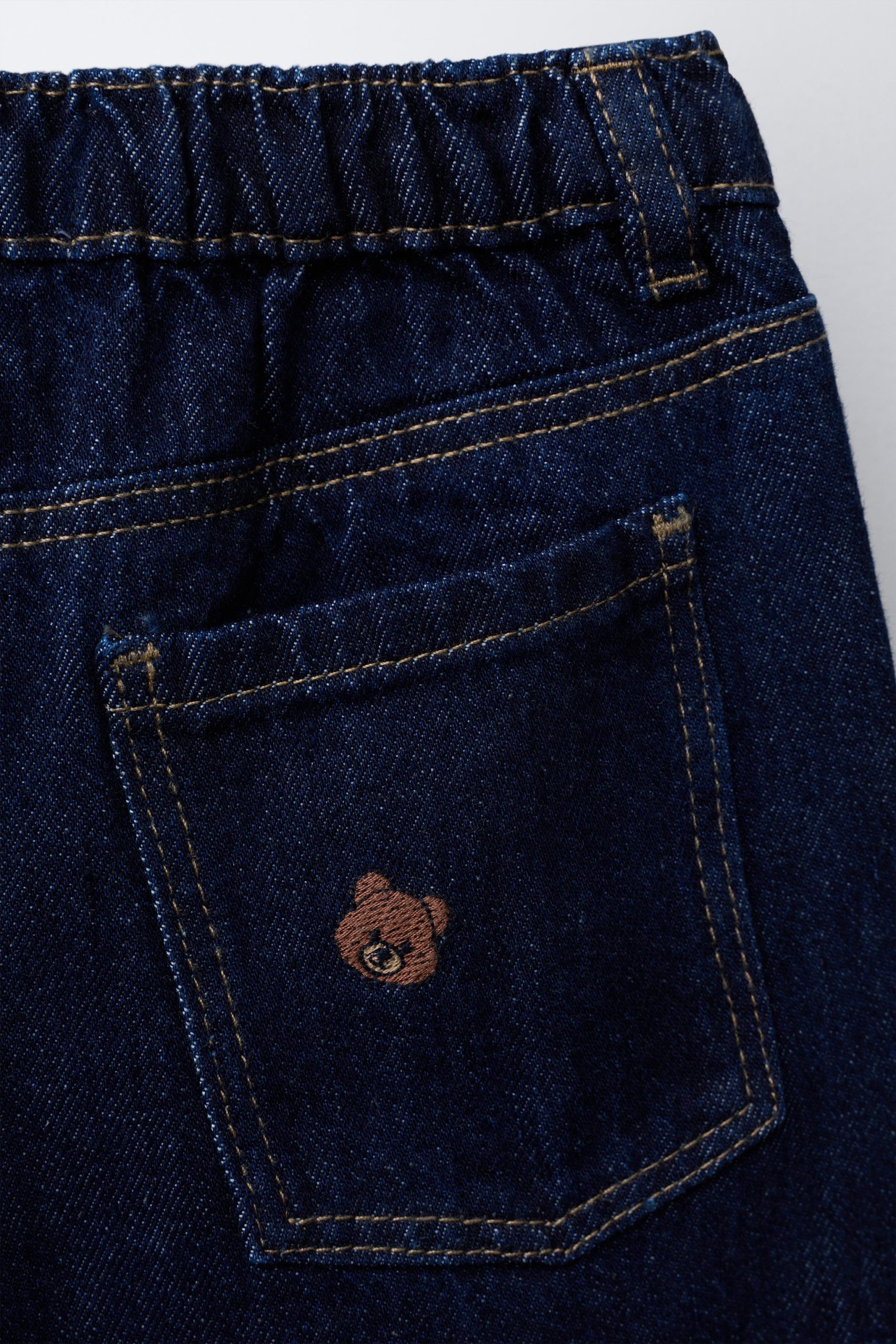 شلوار جین کلوئتی با فیت قابل تنظیم در قسمت کمر، دارای دکمه در جلو و جیب‌های جلو و عقب. با جزئیات دوختی از طرح خرس.