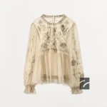 بلوزی از %100 ویسکوز که دارای یقه گرد و آستینهای بادکنکی کشی است. طراحی آن شامل فریزرهای همرنگ، پارچههای سوراخدار و تزئینات گلدار میباشد. همچنین دارای بافت برجسته و مرواریدهای رنگی متضاد است. قسمت پشت بلوز باز و دارای دکمه است.