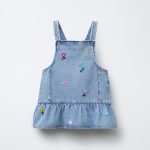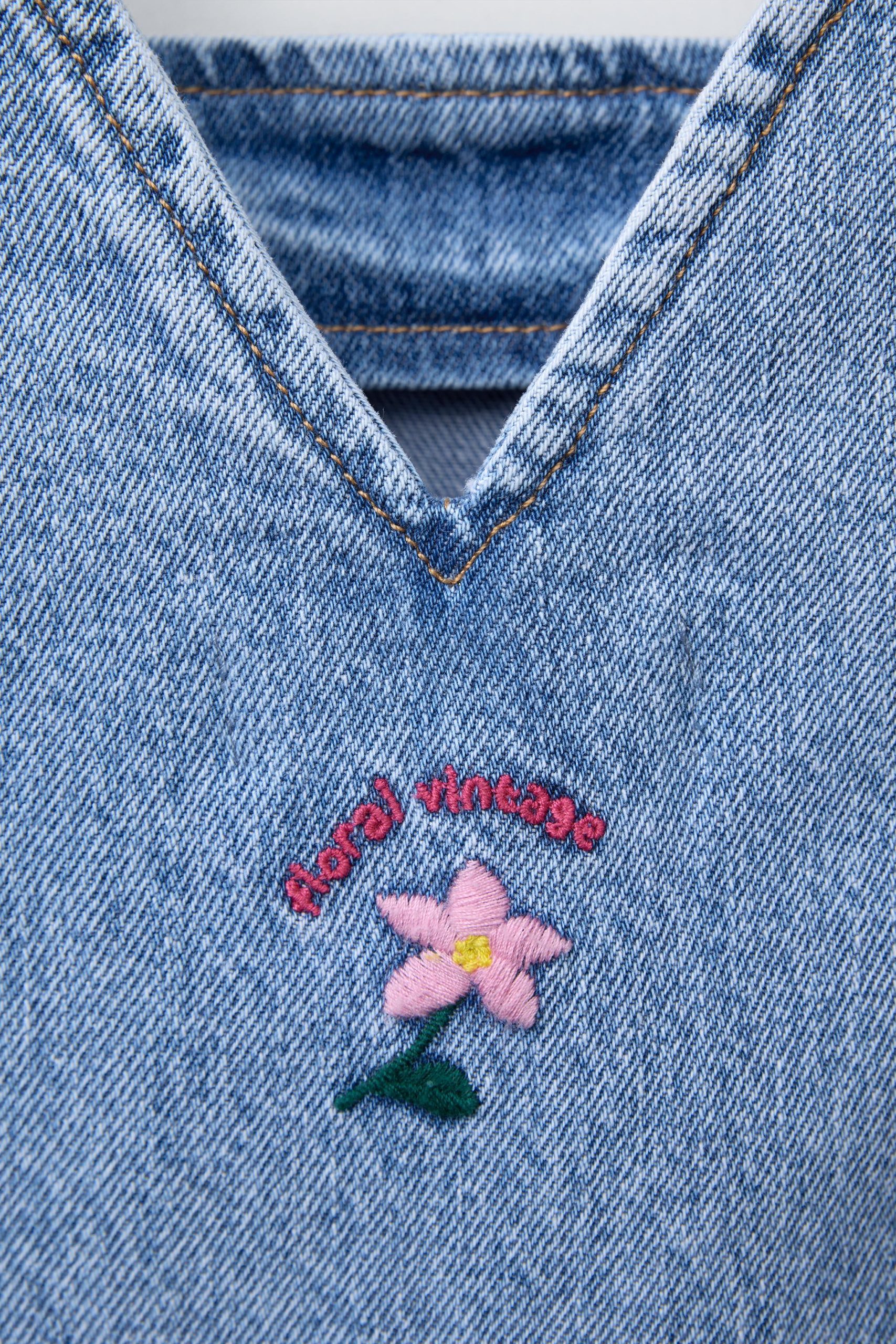 جلیقه دنیم با یقه صاف و دکمههای چسبی در جلو، دارای بندهای قابل تنظیم و دامن چیندار با جزئیات گلدوزی شده از گل.