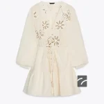 پیراهن بلند با آستینهای بلند و یقه V. جزئیات پارچه برجسته با طراحی متضاد. جزئیات کمربند هماهنگ با پاپیون و مروارید. دارای آستر داخلی. بسته شدن از جلو با دکمه.