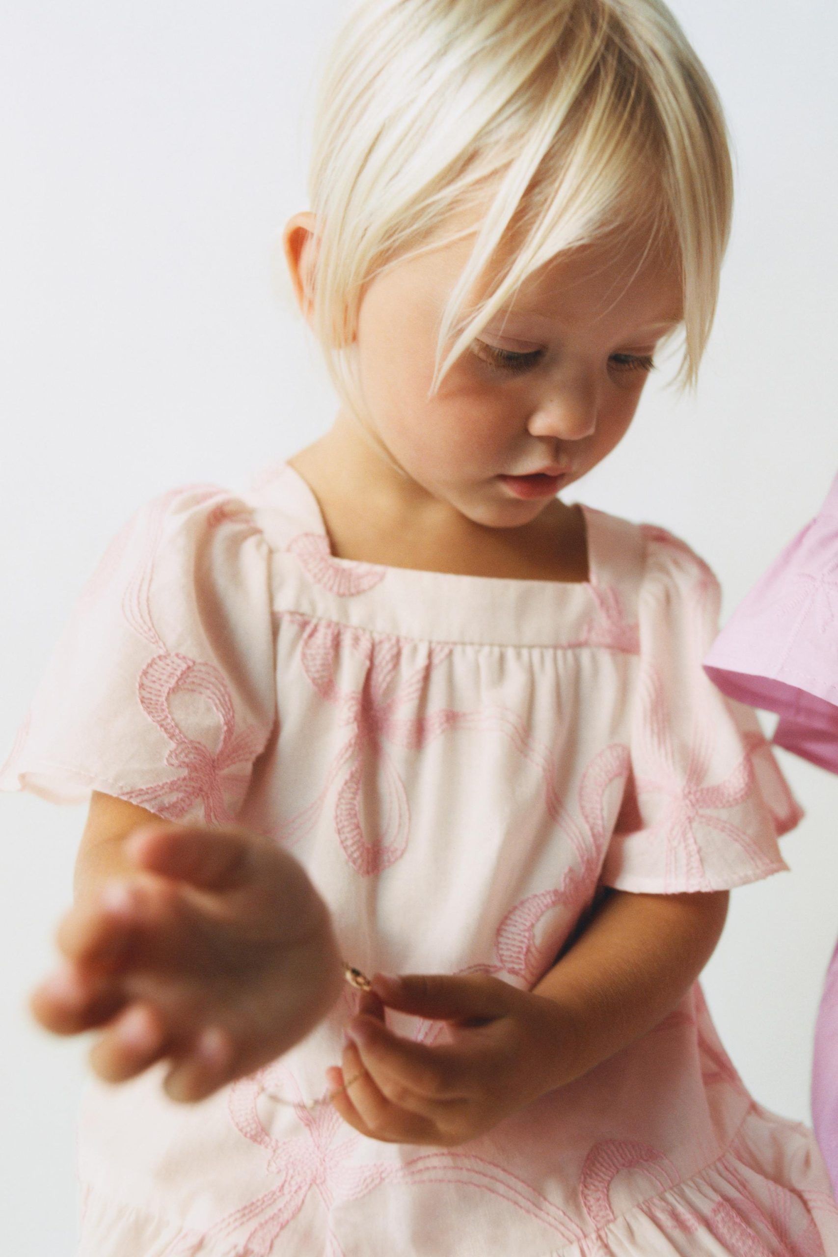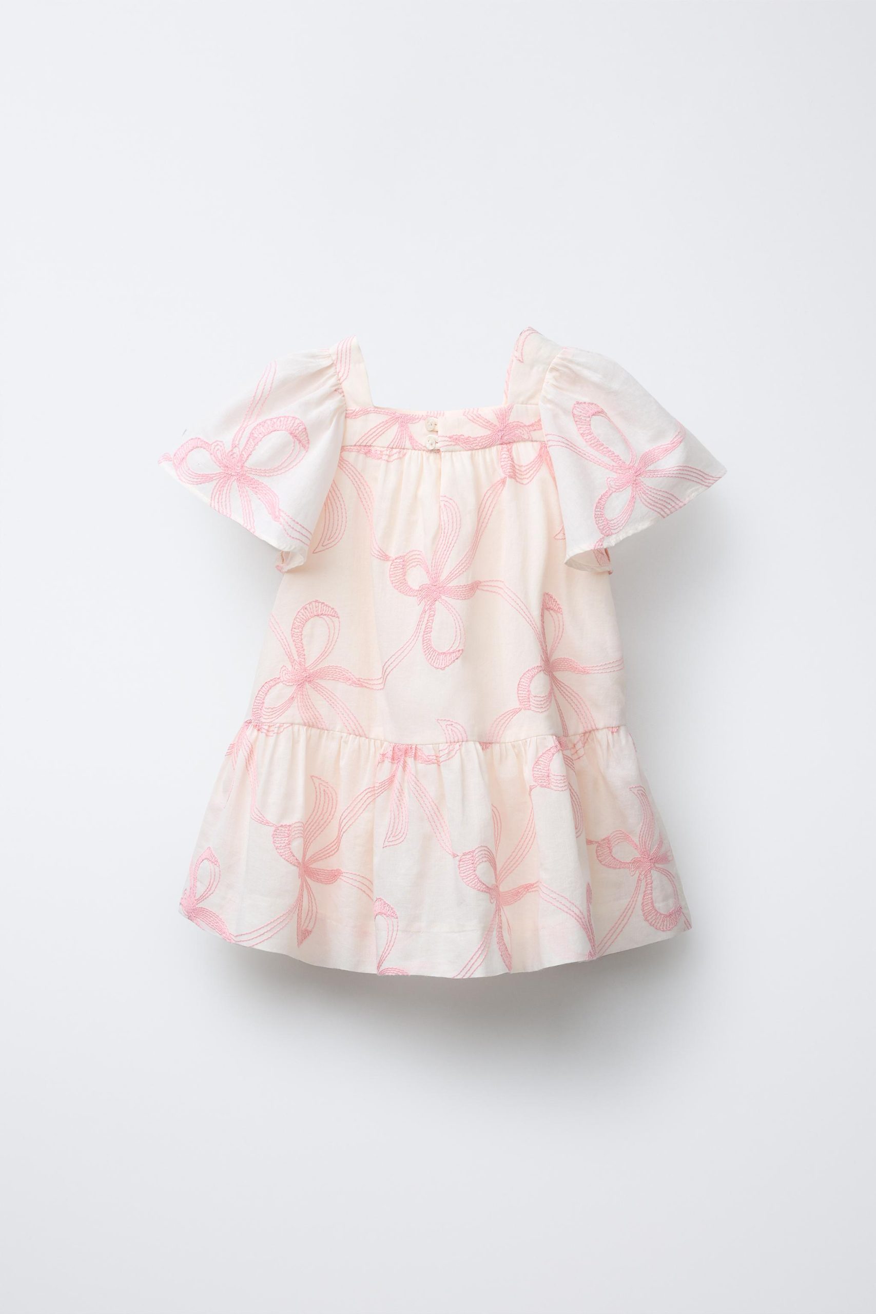 Düz yakalı, kısa kollu elbise. Arkası düğme kapamalı. İşlemeli fiyonk detaylı. İç astarı aynı tonda kombinlenmiştir.
