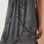 Bağcıklı, ayarlanabilir, yüksek halter yakalı kısa elbise. Önü yırtmaçlı ve işlemeleri boncuk aplikeli. Volanlı etek ucu. İç astarlı.