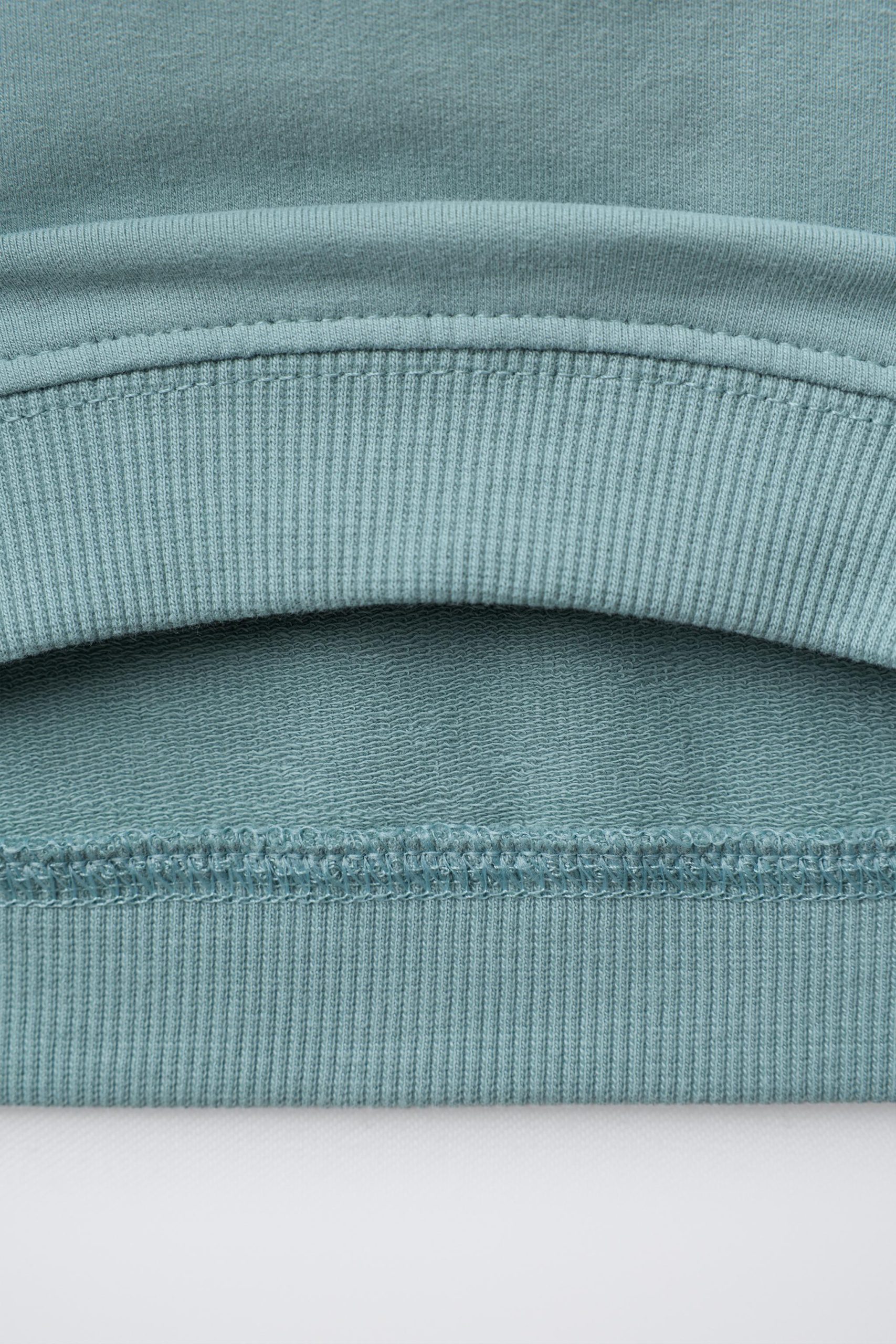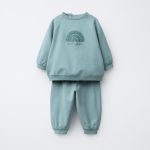 ست دو تکه. سویشرت یقه گرد و آستین بلند. دارای نوار راهراه. جلو با نوشتههای گلدوزی شده و جزئیات حولهای تزئین شده است. پشت با دکمه فشاری بسته میشود. شلوار جگر با کمر کشی و مچهای کشباف.