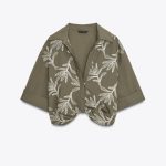 - V yaka, kısa kollu, manşetleri kıvrımlı, yakası açık gömlek. Kontrast işlemeli detaylı. Arkası elastik etekli. Önden düğme kapamalı.