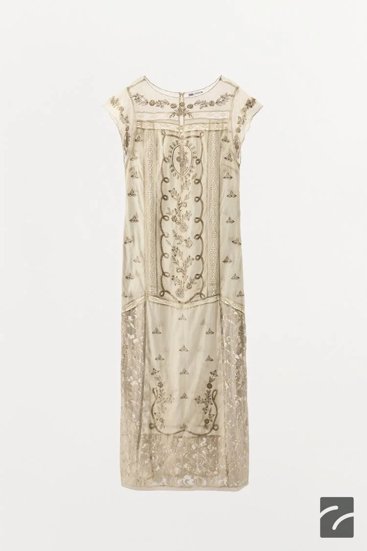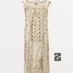 این لباس میدی ترکیبی از %100 الیاف پنبه است. دارای یقه گرد و آستینهای بسیار کوتاه میباشد. تزئینات گلدار با رنگهای مشابه و جزئیات فستو در طراحی آن به کار رفته است. این لباس با دانتل، پولک و مروارید تزئین شده و قسمت پشتی آن باز و با دکمه بسته میشود.