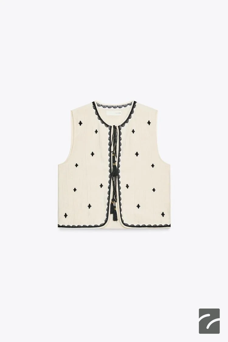 - Bisiklet yaka, kolsuz yelek. Kontrast işlemeli detaylı. Püskül ve boncuk detaylı ön bağlamalı.