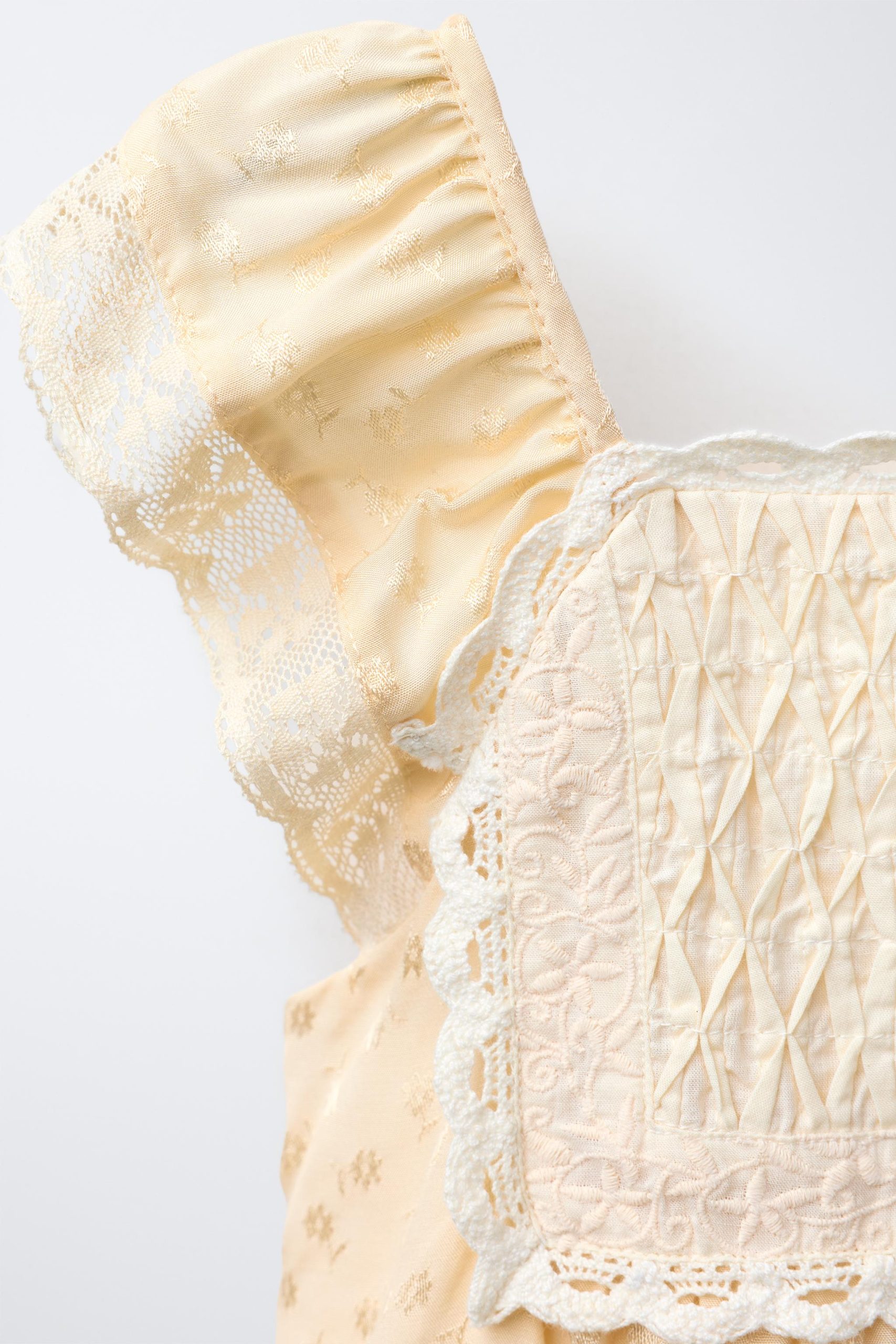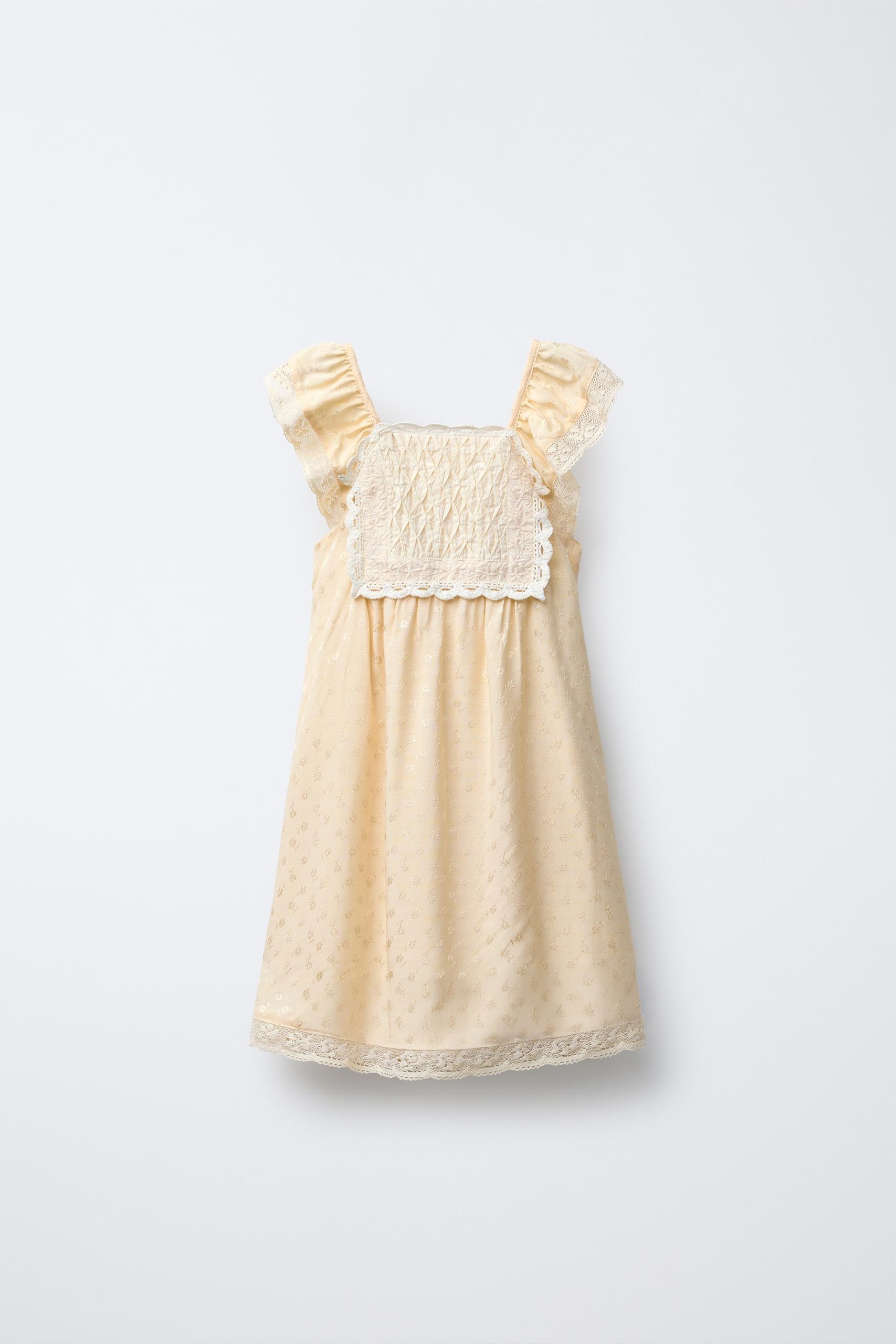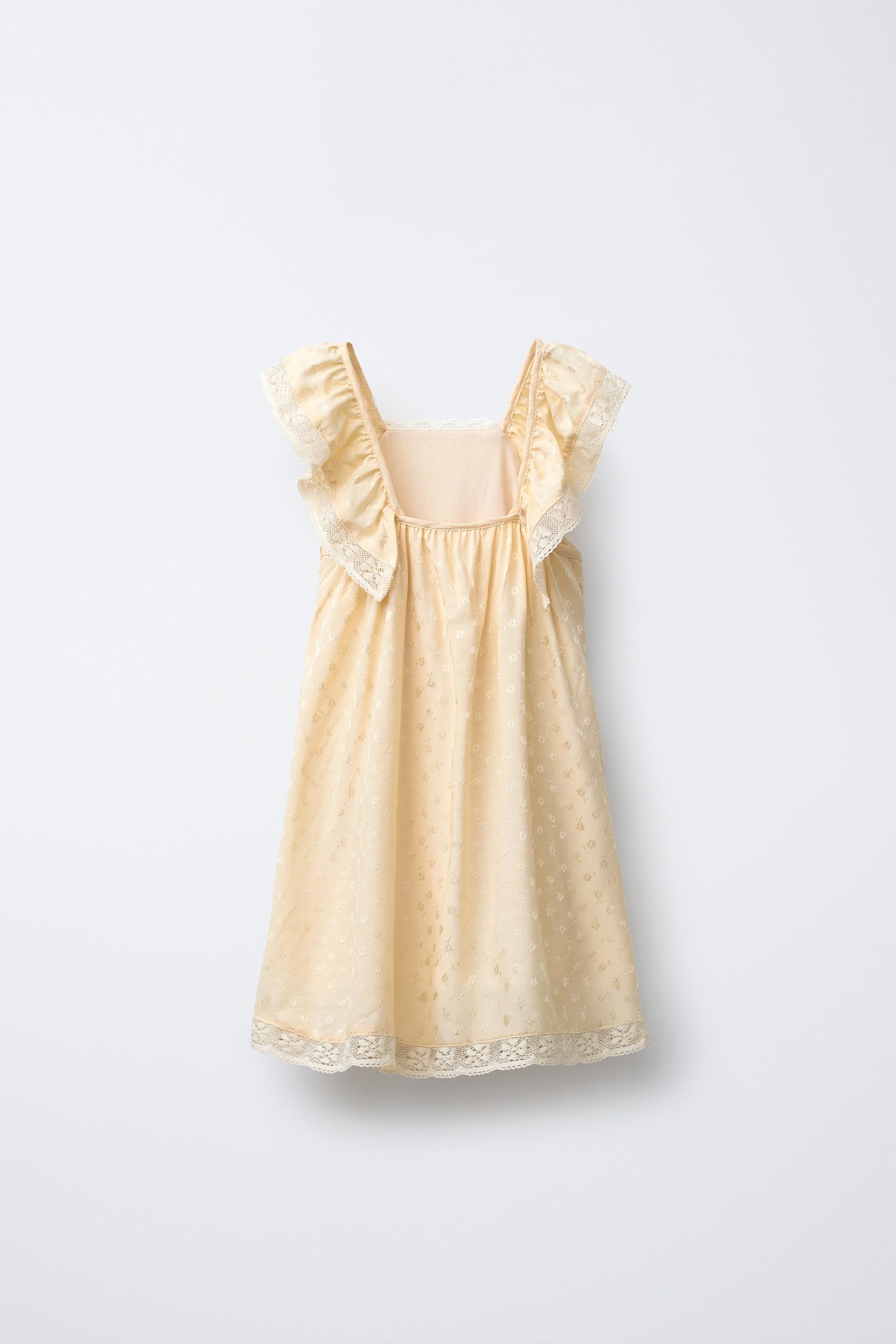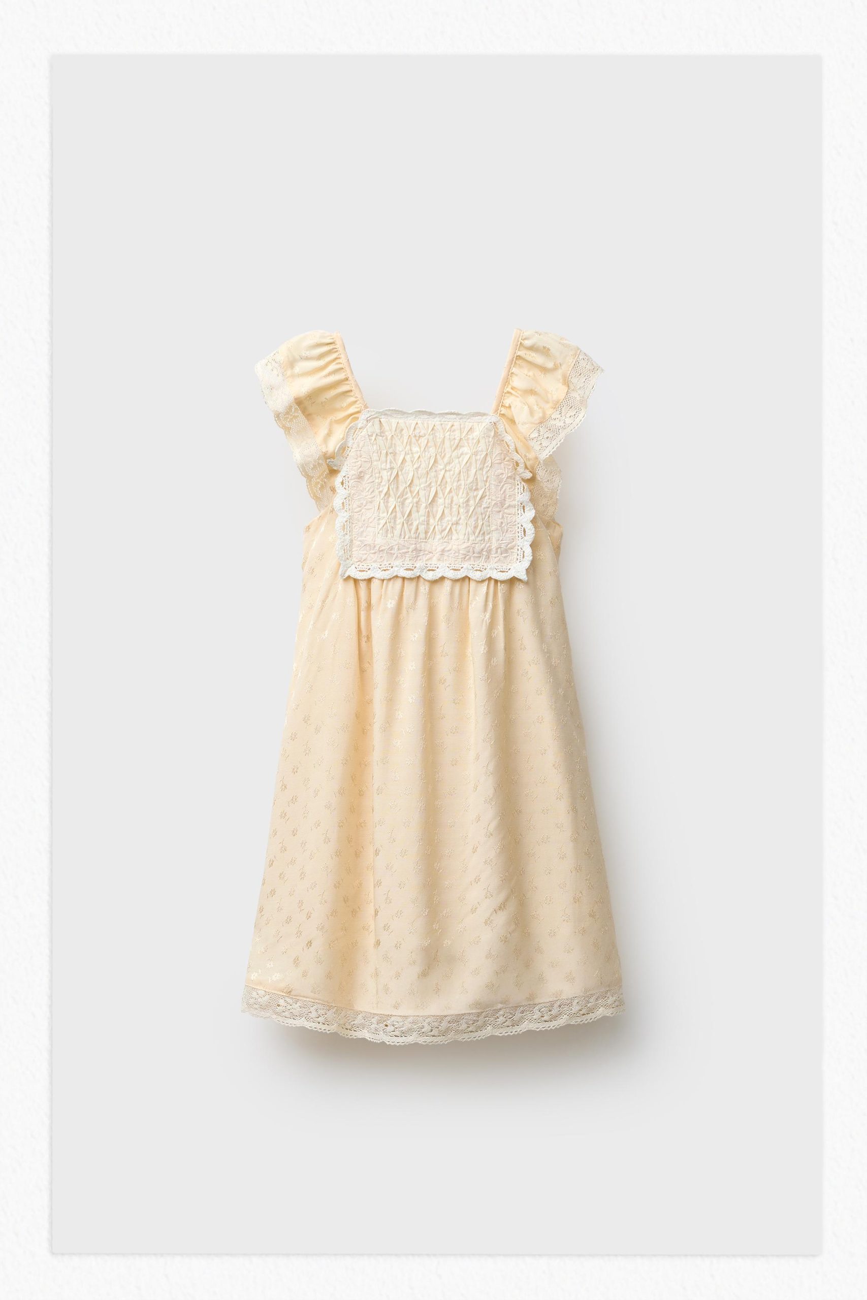 پیراهن آستیندار با یقه صاف و جزئیات دانتل در لبهها. پارچه جکارد با تزئینات جلو. دارای جزئیات گلدار با گلدوزی. لبهها با دانتل تزئین شدهاند. آستر داخلی با رنگی هماهنگ.
