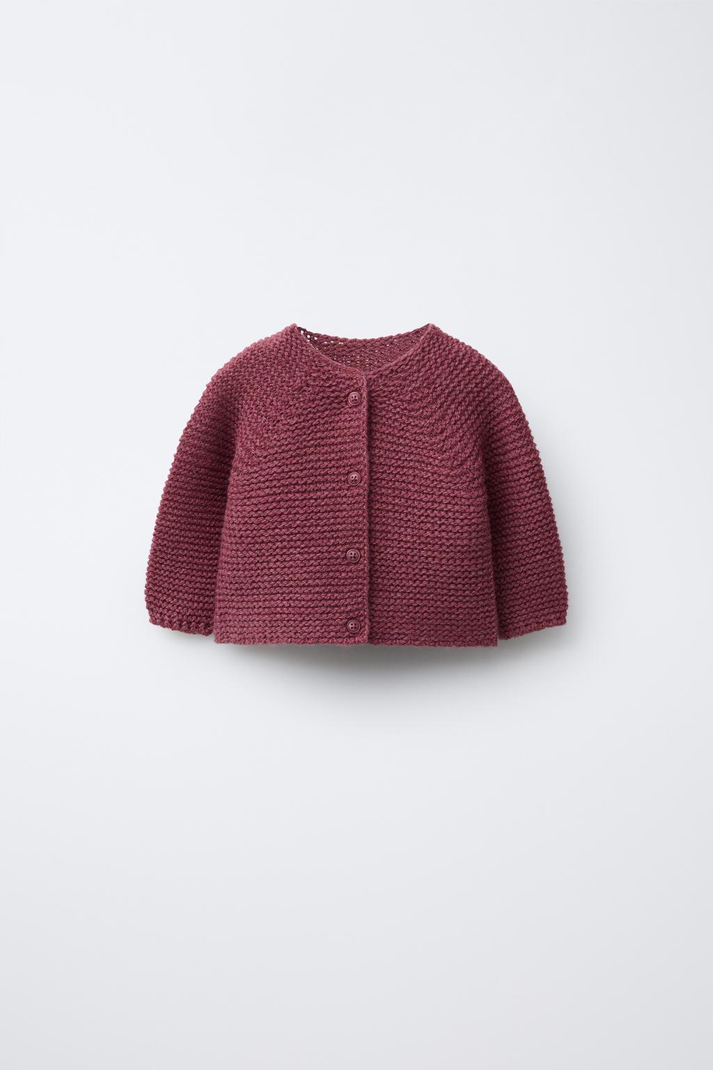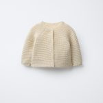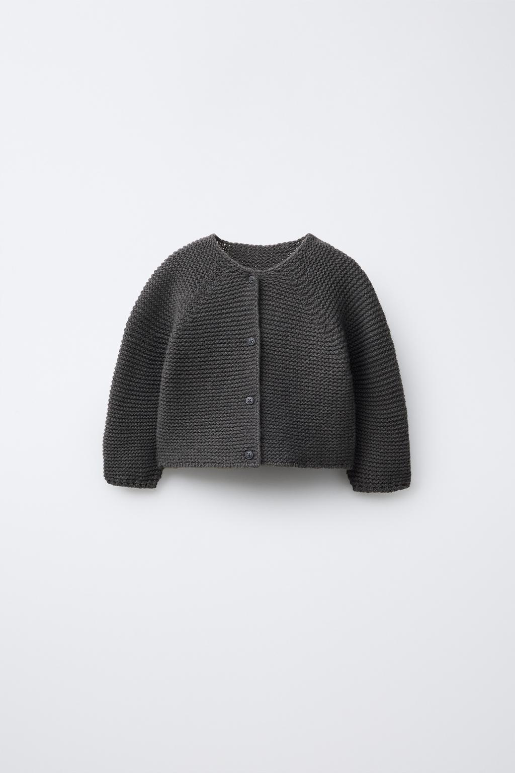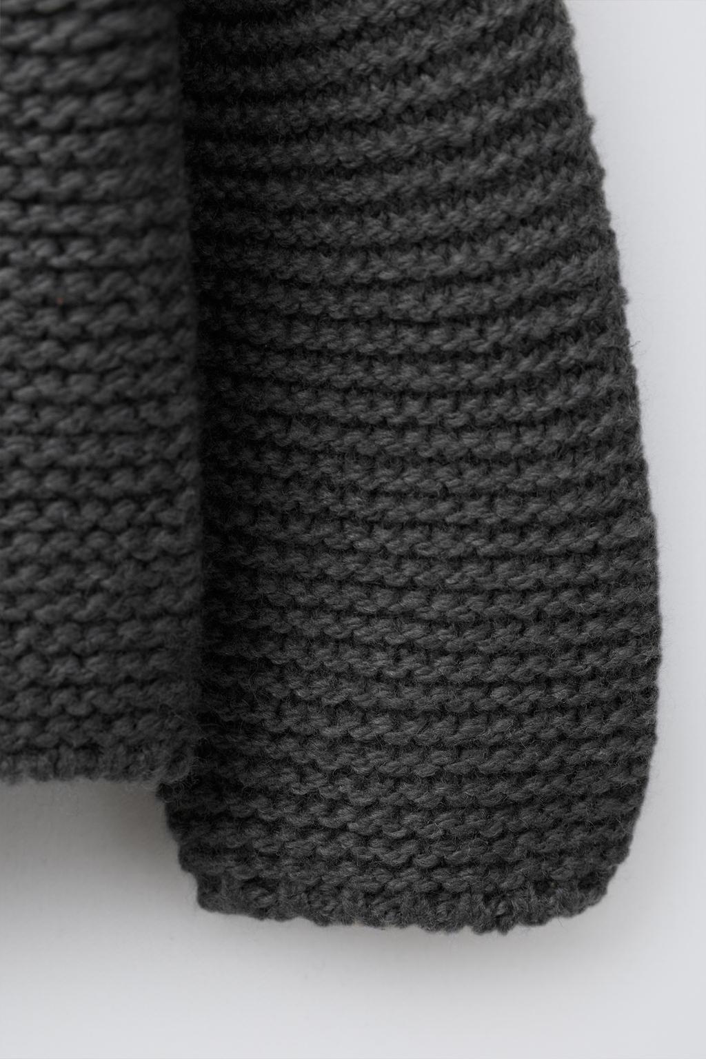 ژاکت با یقه گرد، آستین بلند و بافت ضخیم. دارای بسته شدن دکمهای در جلو.