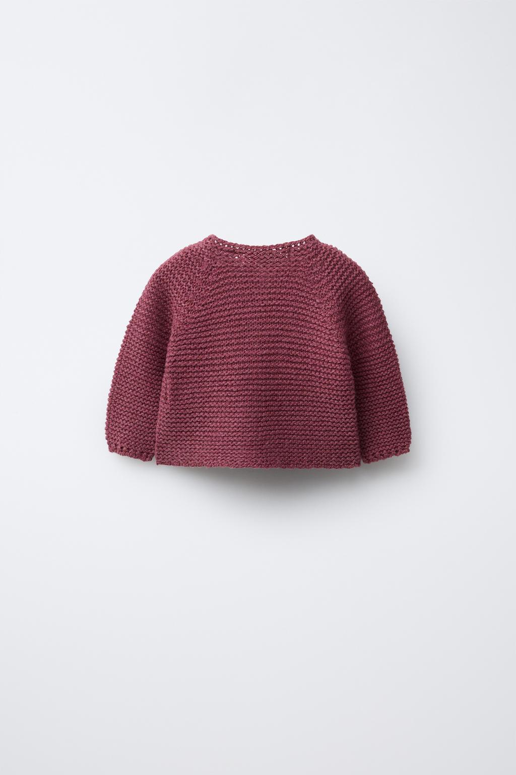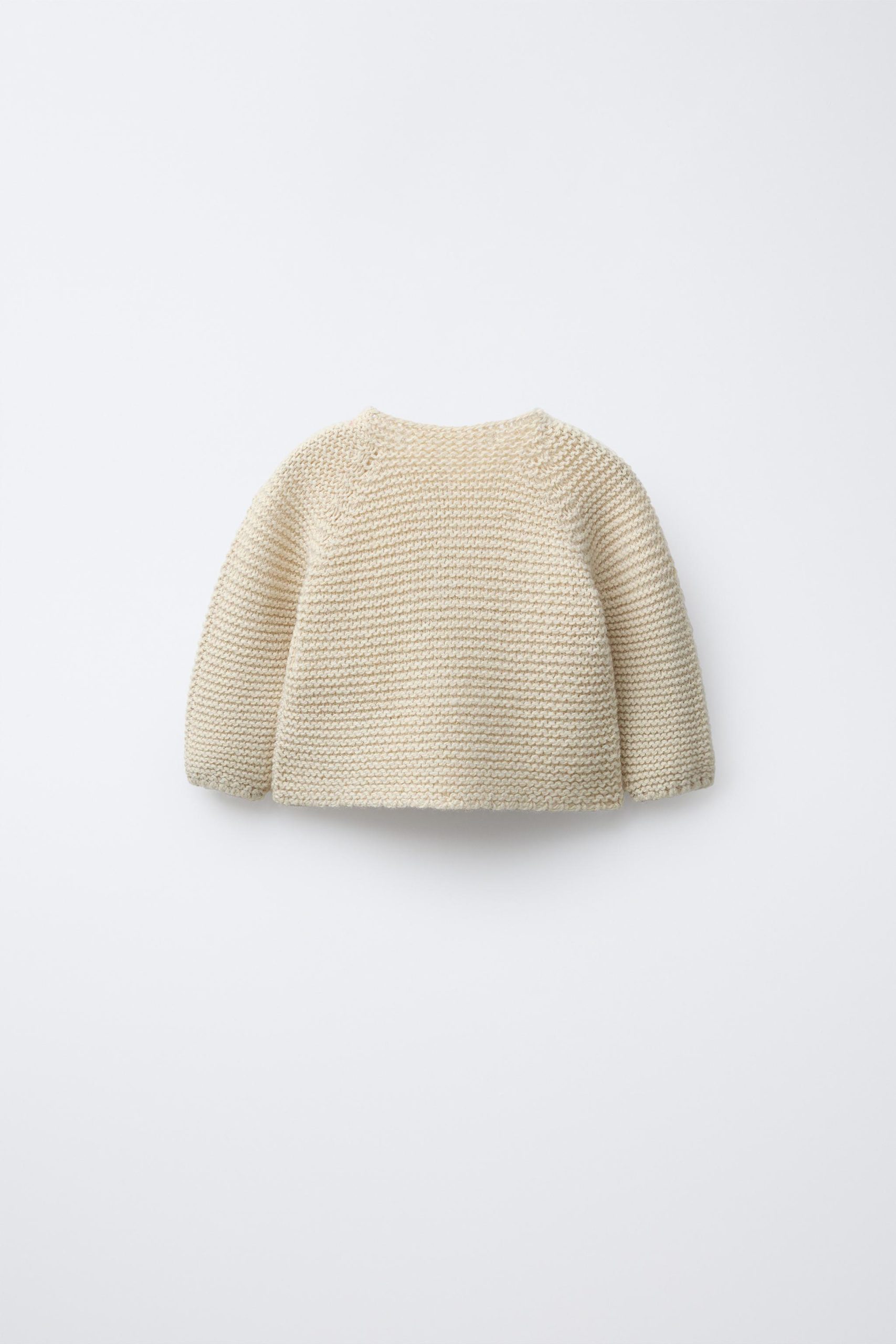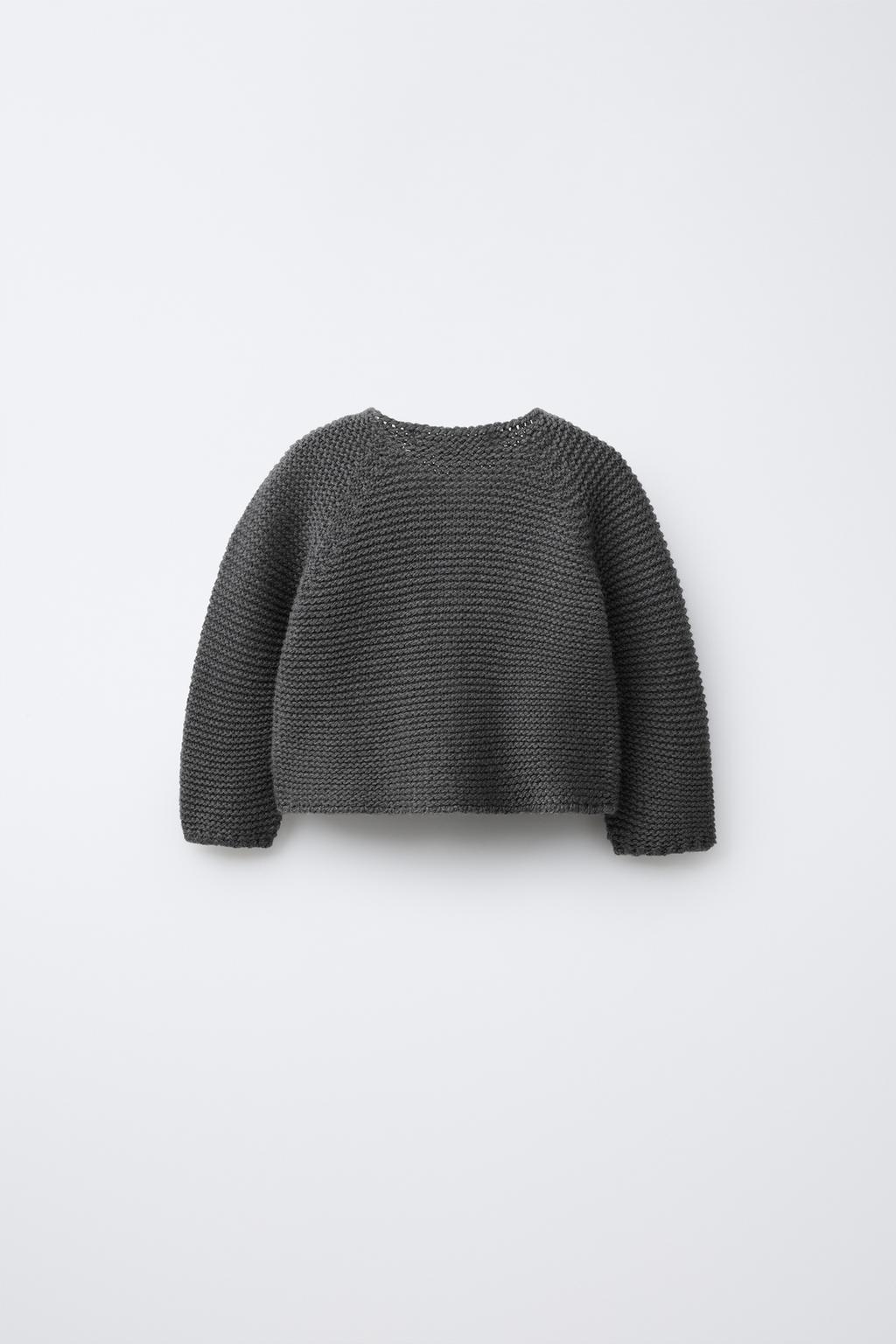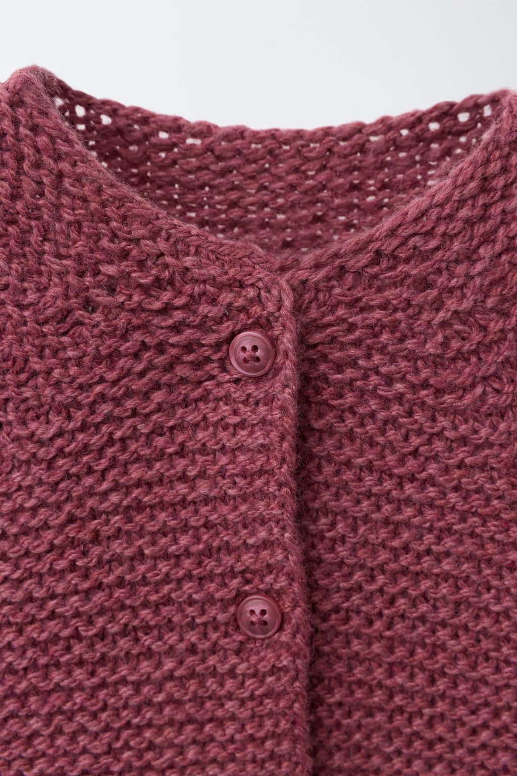 ژاکت با یقه گرد، آستین بلند و بافت ضخیم. دارای بسته شدن دکمهای در جلو.