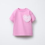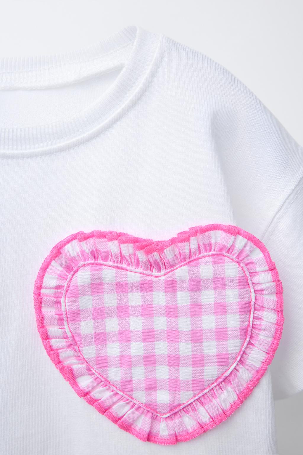 تیشرت یقه گرد و کوتاهمچ با اپلیکیشن قلبی با طرحهای متنوع در قسمت سینه. پارچه ۱۰۰% پنبهای.