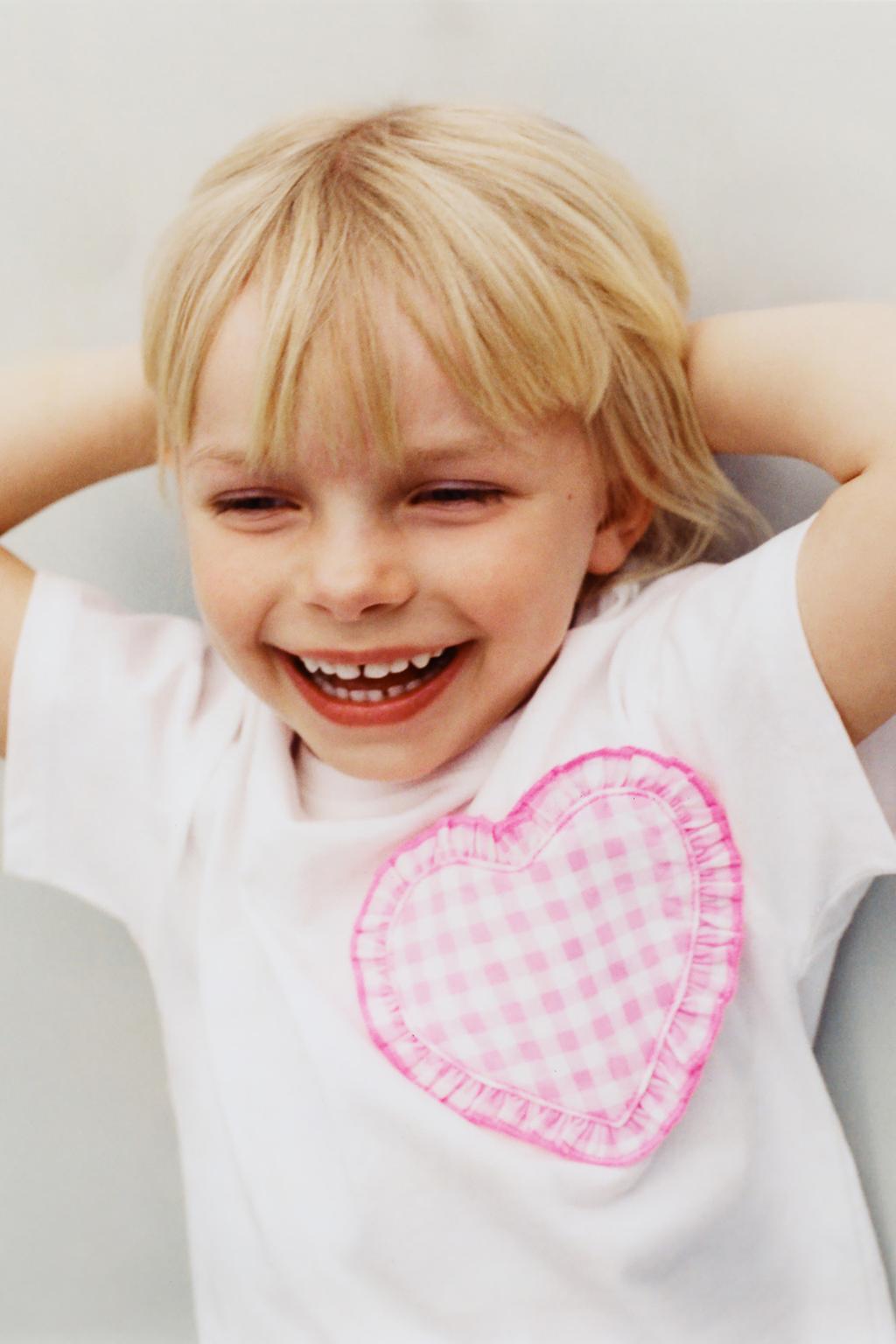 Bisiklet yaka, kısa kollu t-shirt. Göğüs kısmında farklı baskılara sahip kalp aplikasyonu. %100 pamuklu kumaş.
