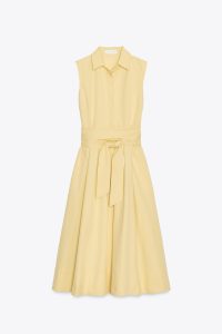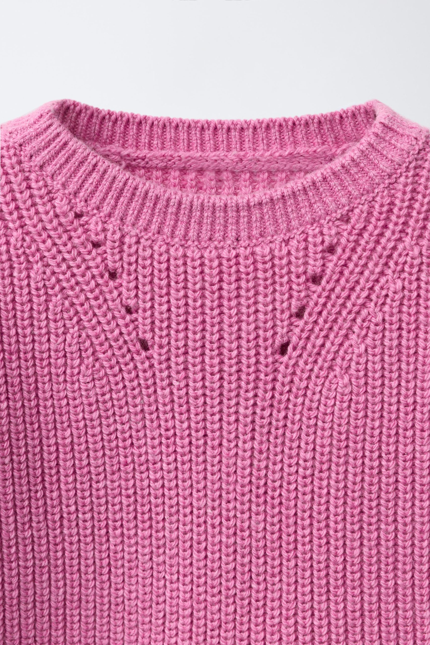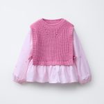 پیراهن آستین بلند با یقه گرد و طرح راهراه و جزئیات قلبی. بر روی آن یقه گرد و جلیقه بافت بدون آستین قرار دارد. در کنارهها، جزئیات بافتنی با بند وجود دارد.